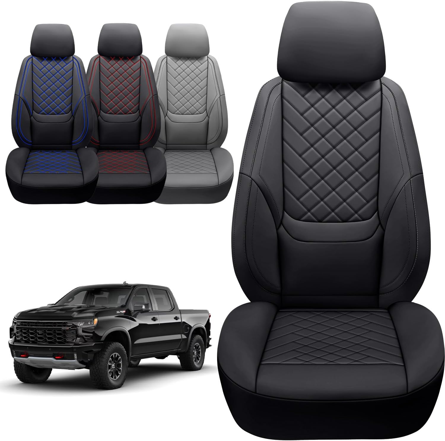 I recently purchased this front seat covers in black and I couldn’t be happier. The quality is exceptional, soft , durable leather with a stylish diamond pattern. Installation was a breeze and they fit perfectly in my 2024 Silverado. The material feels luxurious and is already proving to be stain resistant.