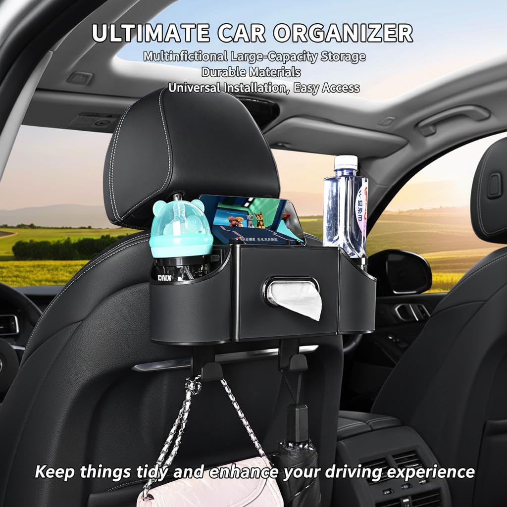 1. 🚗 4-in-1 Multifunctional Storage Solution This backseat car organizer features a smart multi-compartment design, combining a cup holder, tissue box holder, phone holder, and storage hooks in one. This versatile car back seat organizer easily stores water bottles, snacks, tablets, toys, and daily essentials—keeping your car neat and clutter-free.