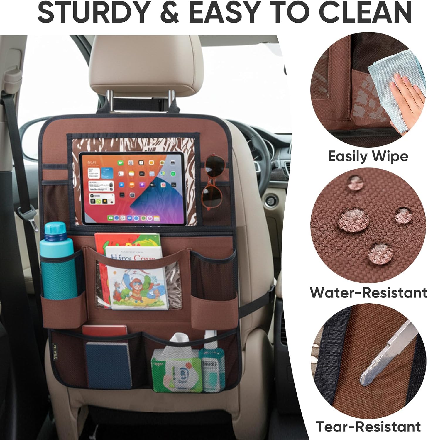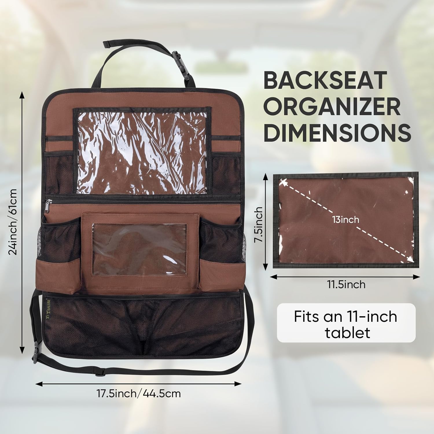 Spacious Storage: Back of seat car organizer measures 17.5 x 24 inches and offers 11 pockets of various sizes for water bottles, tissues, and more; The large zippered compartment keeps items safe and secure