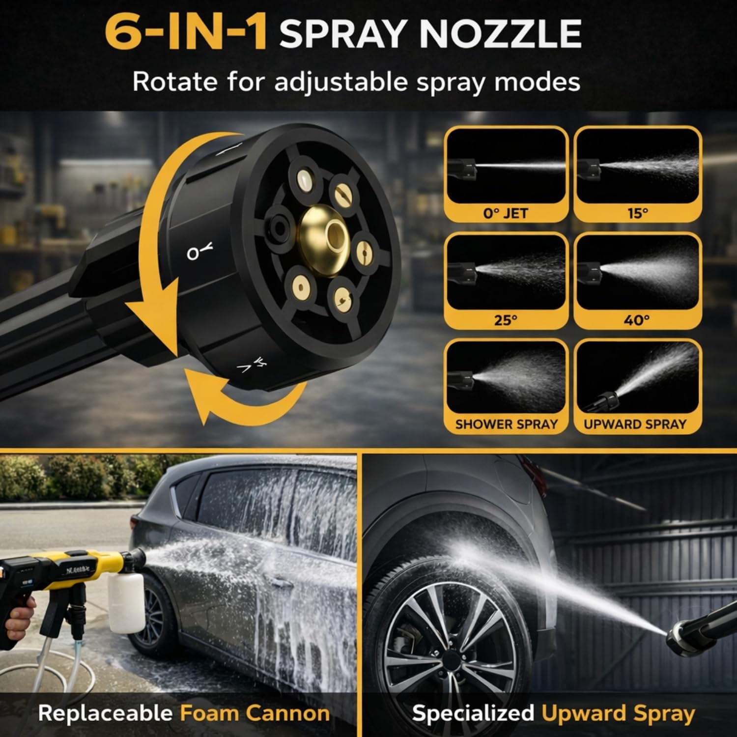 6 SPRAY PATTERNS & 3 PRESSURE SETTINGS: The cordless pressure washer battery powered includes a 6-mode spray nozzle and 3 pressure levels, allowing flexible cleaning from gentle rinse to powerful jet spray. Perfect for bikes, boats, RVs, motorcycles, windows, and garden furniture