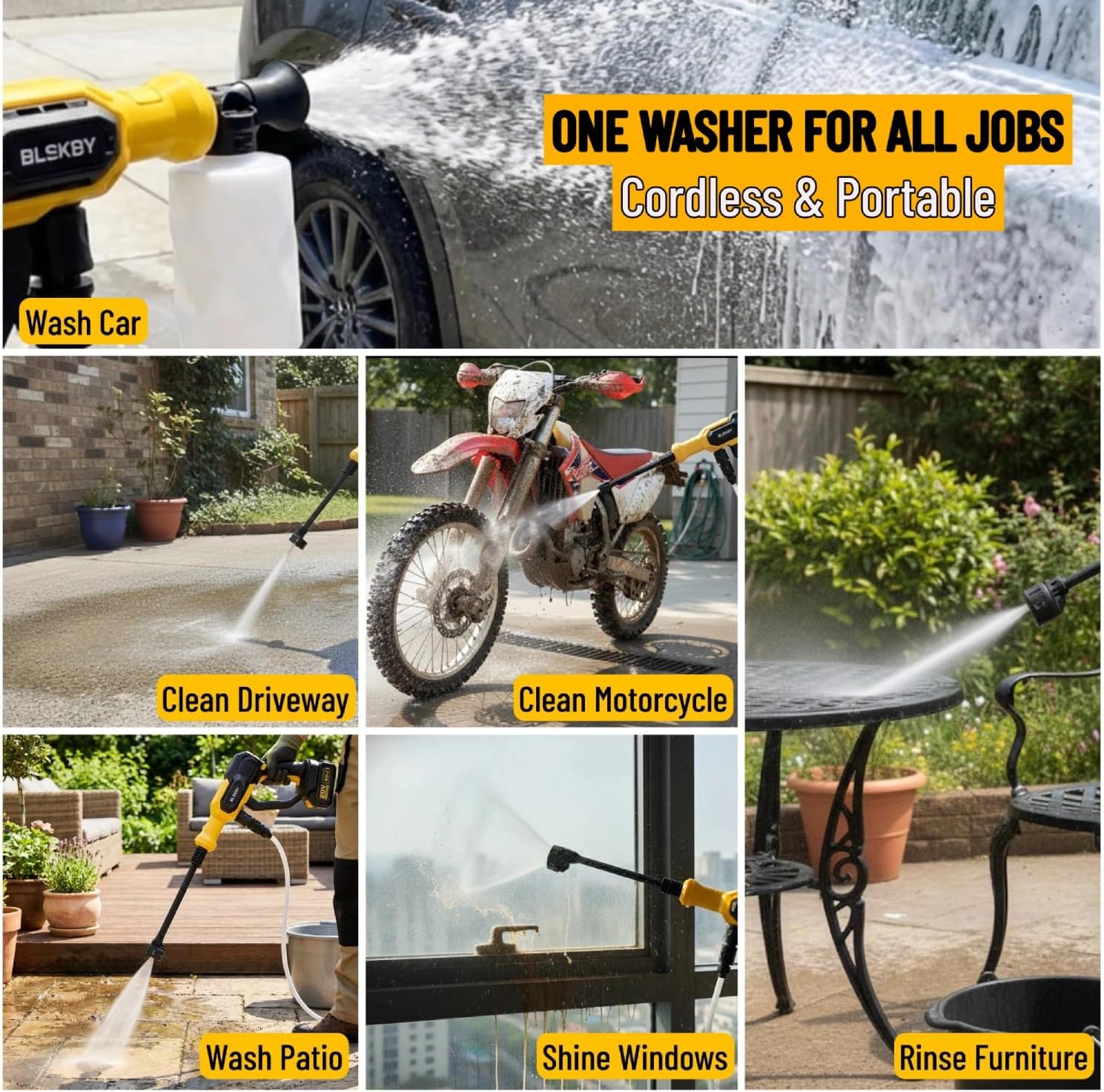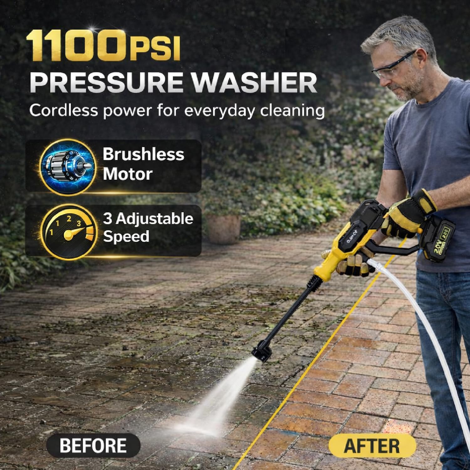 POWERFUL CLEANING PERFORMANCE: Delivering up to 1100 PSI and 390 L/H water flow, this portable pressure washer cordless easily removes dirt from cars, patios, fences, and garden furniture; The 300W pure-copper brushless motor provides strong, stable power with quieter operation and longer lifespan