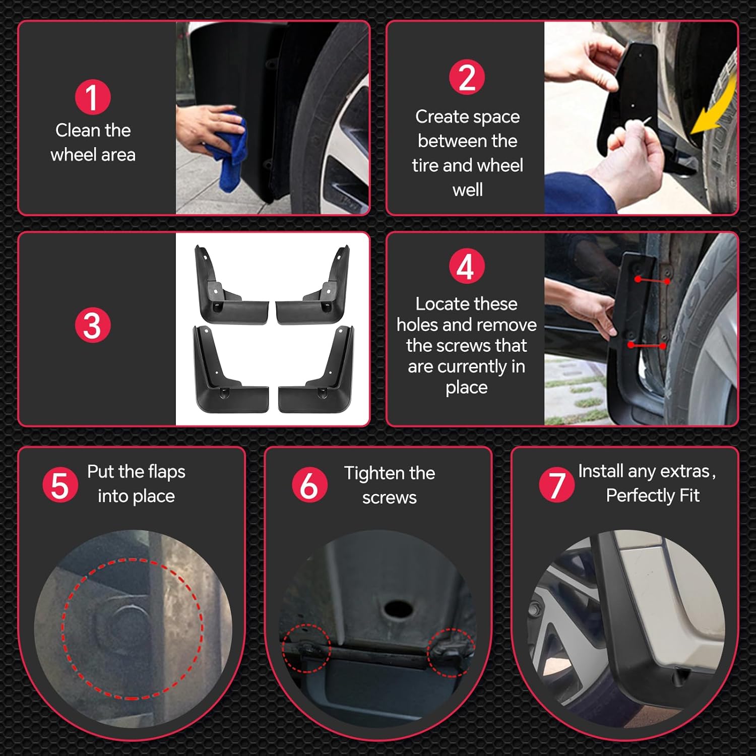 【Easy Installation】Fender flares for your car are fast and simple to install & remove. No drill is required, without wheel, or tire removal. There are holes in the fender, easy to install, and saves you time. A bag of fixings screws you need is included, just install them in the original hole position, and the splash guard will stay in place after the installation, perfectly matching your car model.