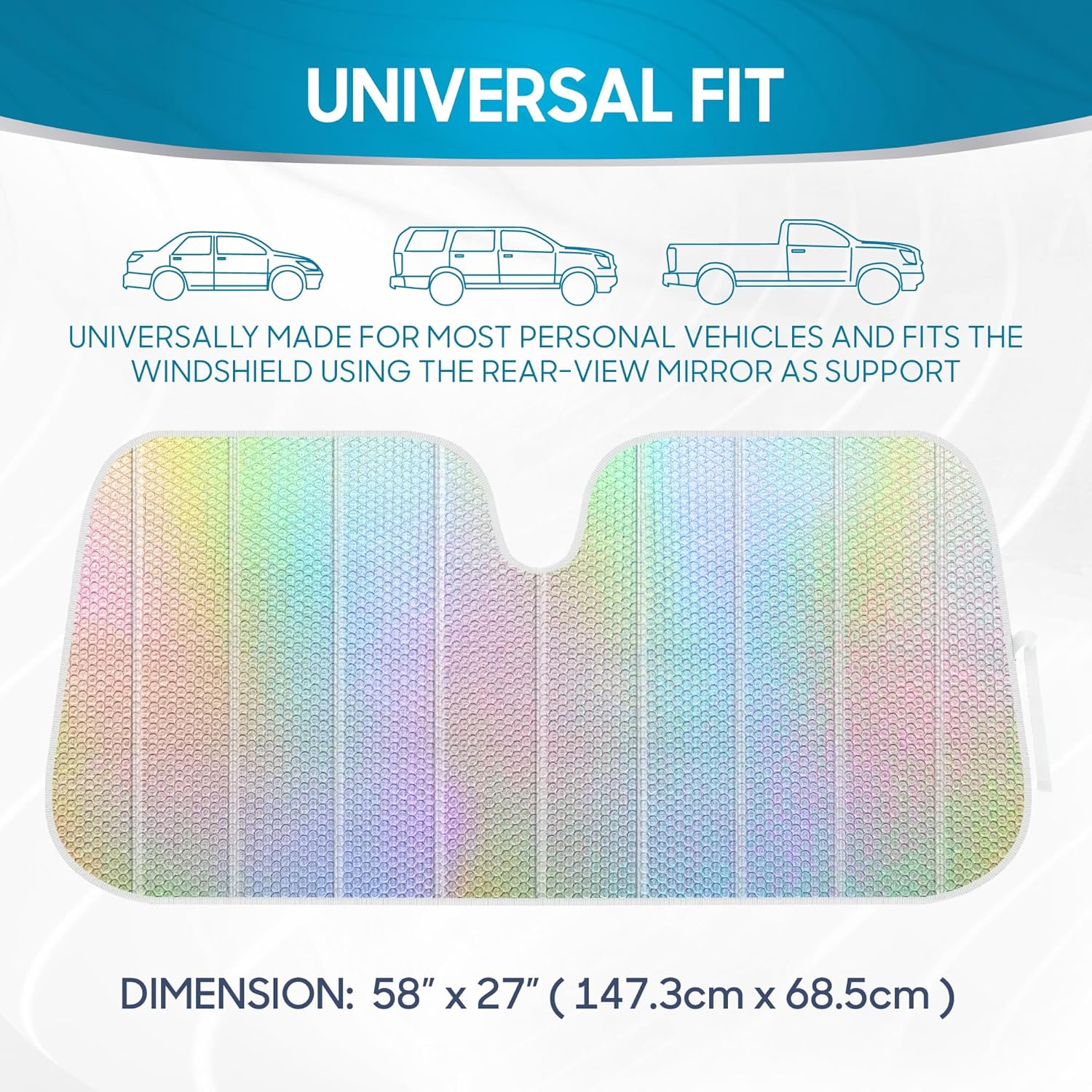 TOP QUALITY FITMENT: Size: 58″ Width x 27″ Height. This car sun shade is universally made for most personal vehicles and fits the windshield using the rear-view mirror as support. The tapered edges allow for a more snug fit.