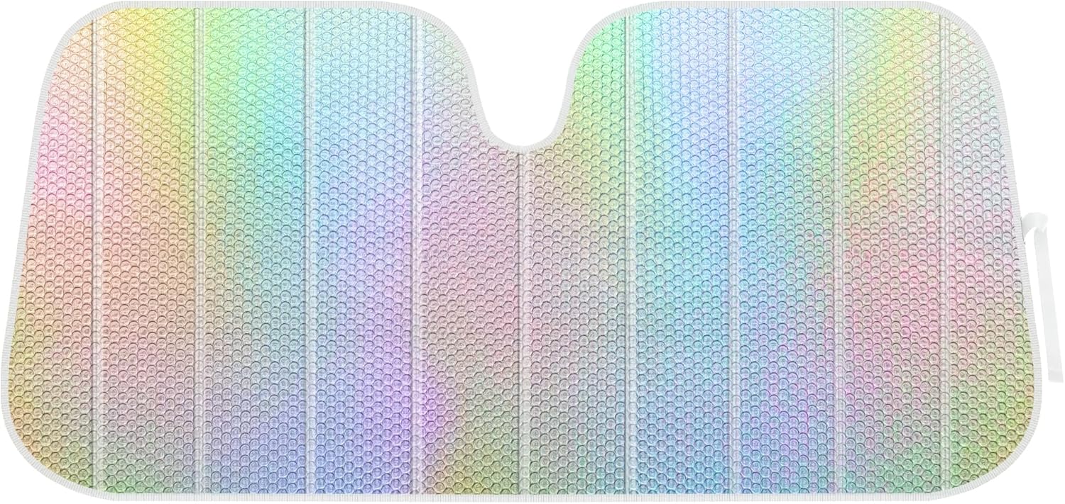 This is cute and exactly what I wanted – subtle and durable! It’s not as “bright” as the picture shows, however, I find that even better because it’s still irridescent but not tacky. Height wise, it fit my 2024 Kia K5 GT perfectly and I just dropped the sun visors down to hold it in place. The mirror cut out is also perfect. The only “issue” is that it’s just a tad much on the length, but it’s not a deal breaker. I wfh and my car sits in the driveway all day, getting beat by the sun so this is great to not only keep me from burning my chicken legs (leather seats, IYKYK), but also to keep my dash from fading and steering wheel from peeling! I decided not to add a pic because it’s June Gloom and looks blah, but I promise it’s worth buying! Get it! 😊