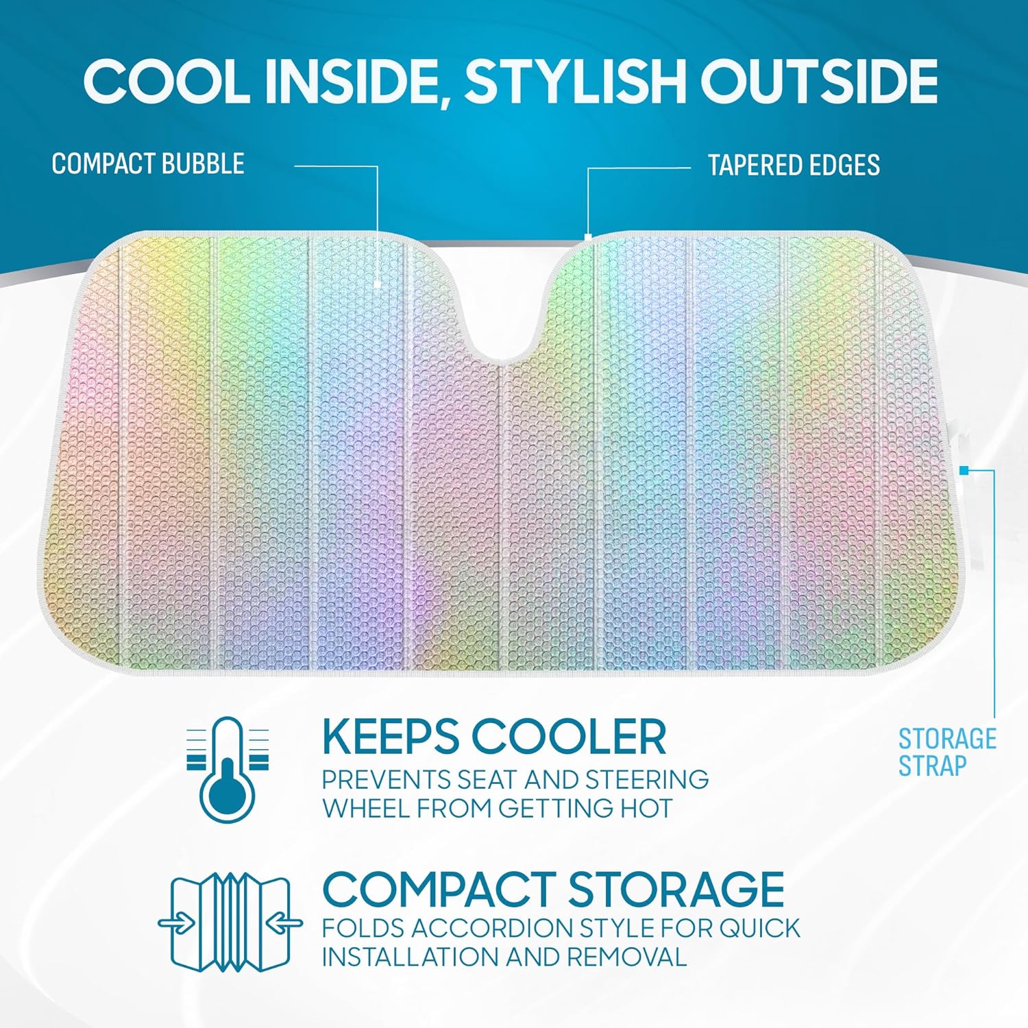 100% UV PROTECTION: Dual-Layer Bubble design for maximum protection for your vehicle’s interior, this sun shade for car windshield will keep your seats and steering wheel cool by blocking the sun’s heat and harmful UV radiation rays.