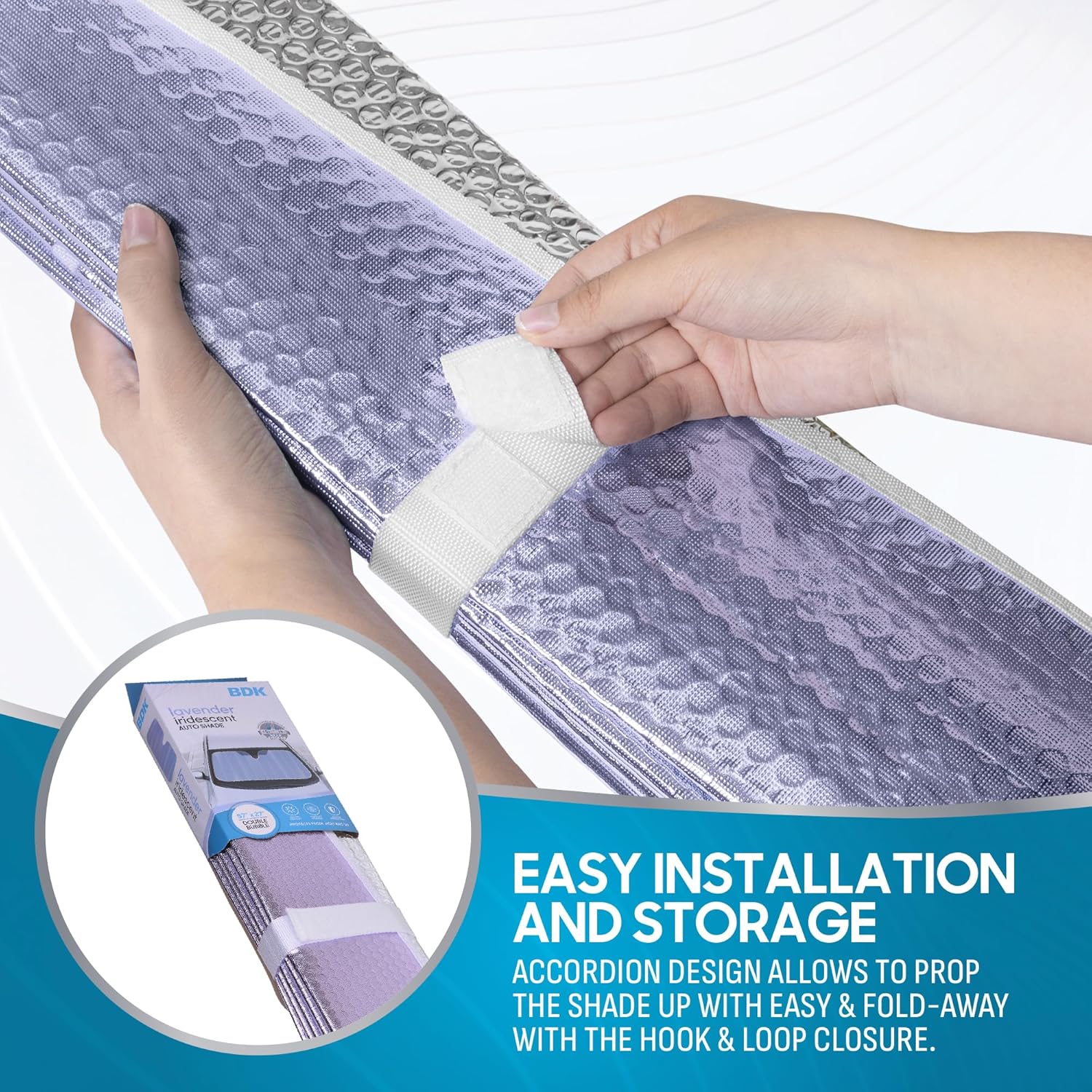 QUICK AND EASY SETUP / REVERSIBLE: The foldable accordion sun visor for car windshield design allows you to prop the windshield shade up with ease and fold-away storage with a Hook & Loop closure. With a universal design, the car shades for front windows can also be reversed and used on both sides with the same protection!