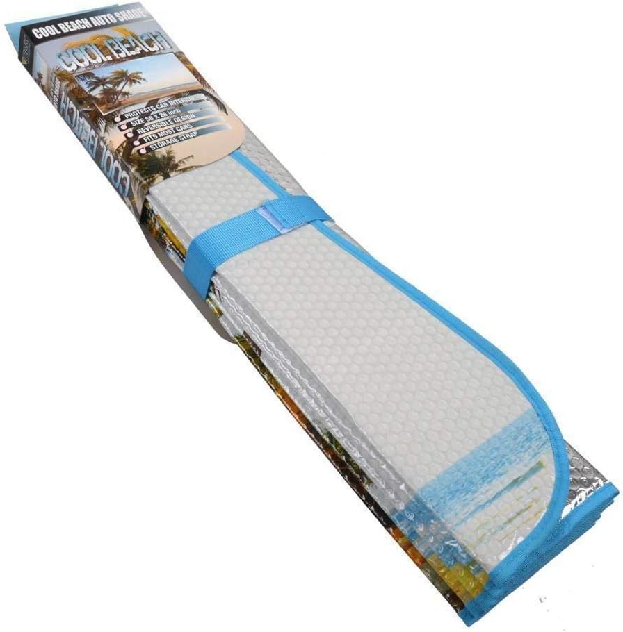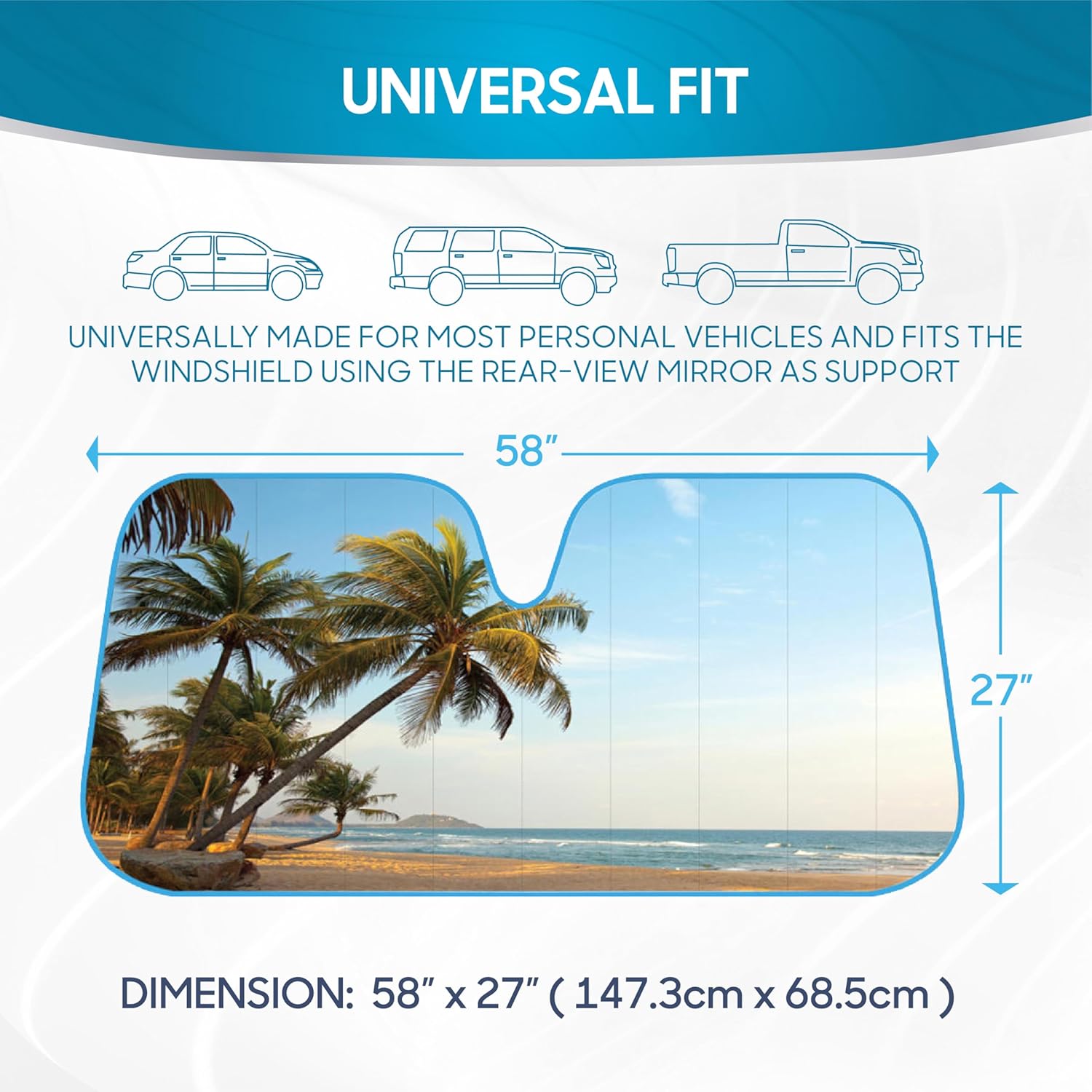 TOP QUALITY FITMENT: Size: 58″ Width x 27″ Height. This beautiful tropical beach & palm trees Sun shade for car windshield is universally made for most personal vehicles and fits the windshield using the rear-view mirror as support. The tapered edges also allow for a more snug fit.