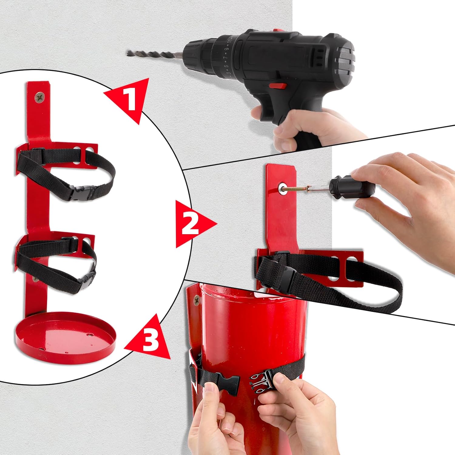 Widely used: The fire extinguisher bracket is suitable for home, kitchen, school, garage, car park, vehicle, boat, laboratory, gym, office building and other multiple use places.