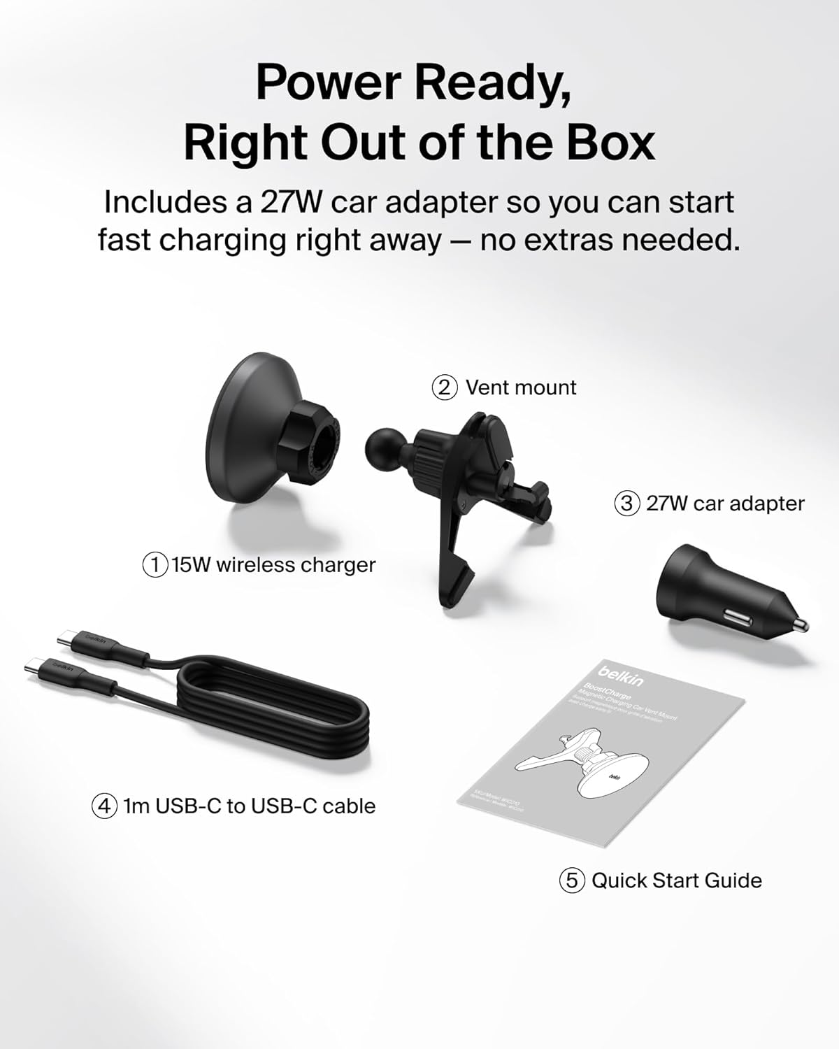 27W CLA & USB C CABLE INCLUDED: This Belkin Magnetic Car Charger comes with a 27-watt power supply and 1M USB C to USB C cable, so you can begin immediately charging right out of the box without the need to make any additional purchases.