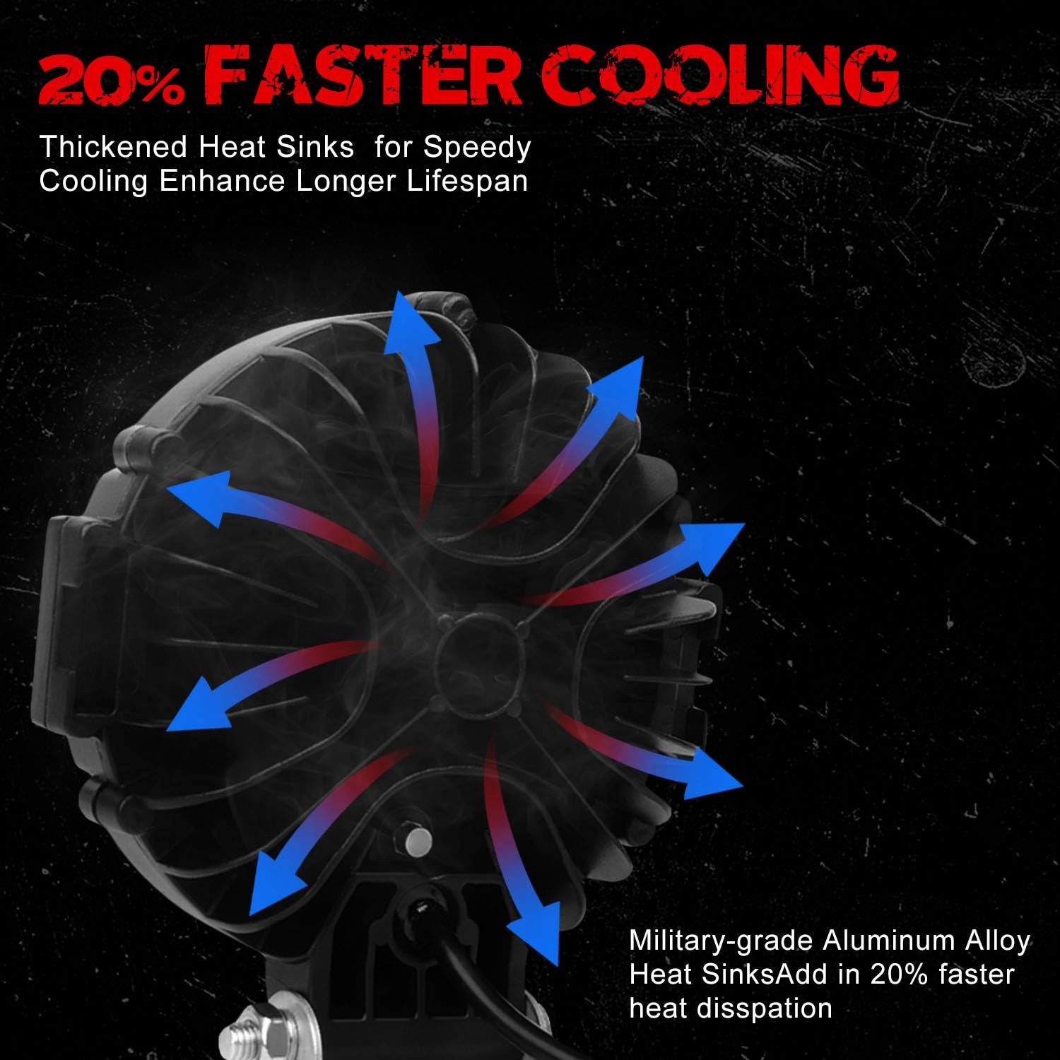 Excellent Heat Dissipation: Our Offroad LED Light Round uses 6063 aluminum alloy as the casing which can has best heat dissipation and best seal ability for the heat sink. The sharp aluminum fan design, makes it dissipate heat faster and more effectively. With upgrade breathing hole to release moisture to the lifespan of the light bar beyond 50,000 hours