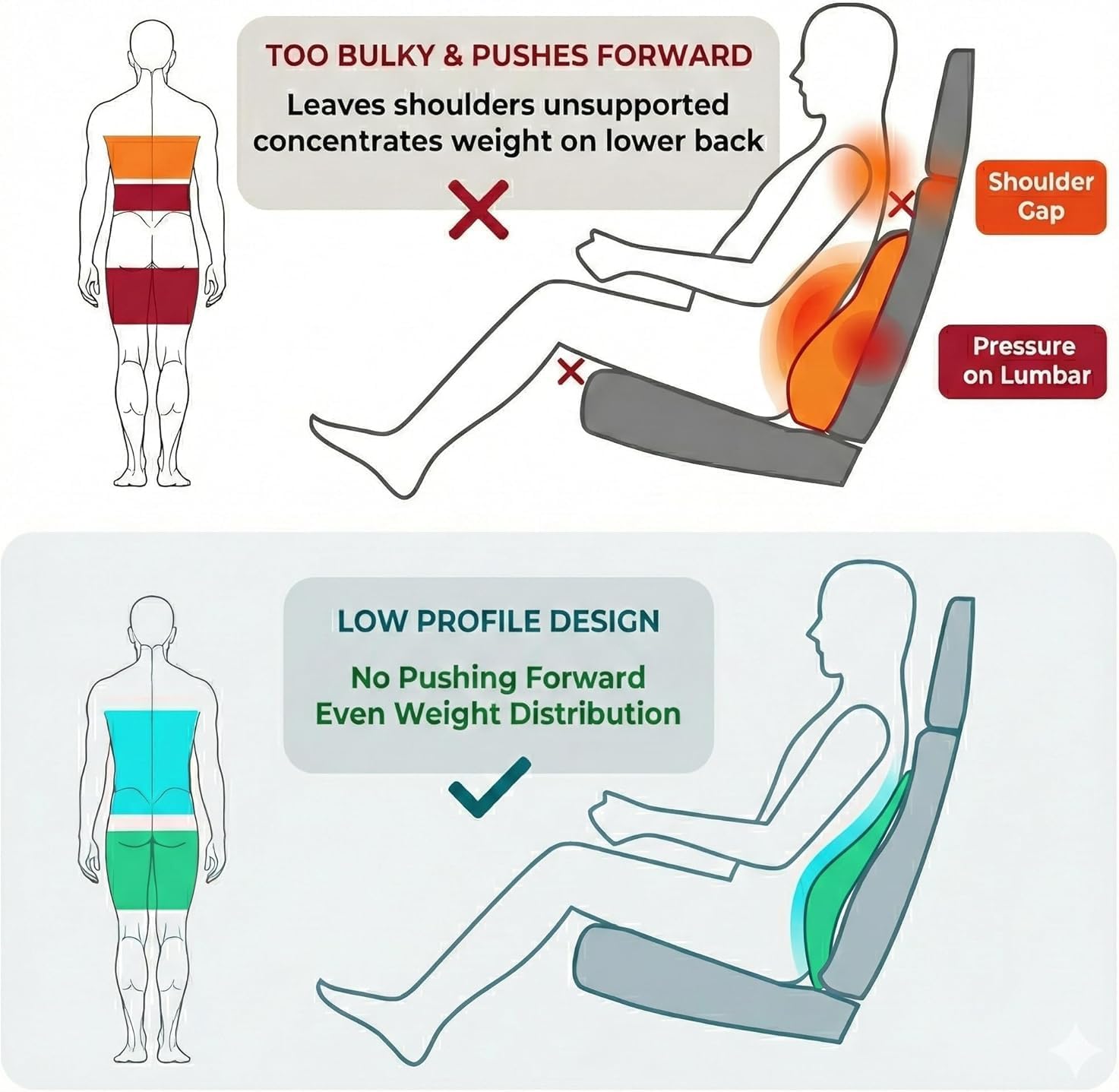 【Targeted Lower Back Support】Contoured ergonomic design follows the natural curve of your spine to fill the gap between seat and lower back, helping you maintain a healthy posture and reduce pressure during long driving or office work.