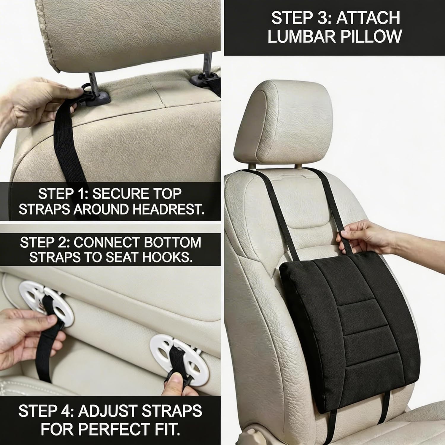 I bought this for 2021 Chevy Silverado. The straps are not long enough to go completely around the back of the seat. I connected the straps behind the headrest and then crammed the two bottom connectors (for lack of a better word) into the back of the seat so they flip and stay. The back of the seats are not like they used to be, there is a flap that covers the back crack (sorry I used that term) so trying to connect them–even if the straps were long enough–would not work.This Silverado does not have lumbar in the seat and the little bit of padding helps my lower back. I can move it around to put it where I need it. It is soft material and it slides when I get in because I have leather seats. All in all it does it’s job, and it’s nice to have something that doesn’t fall forward when I get out of my truck.