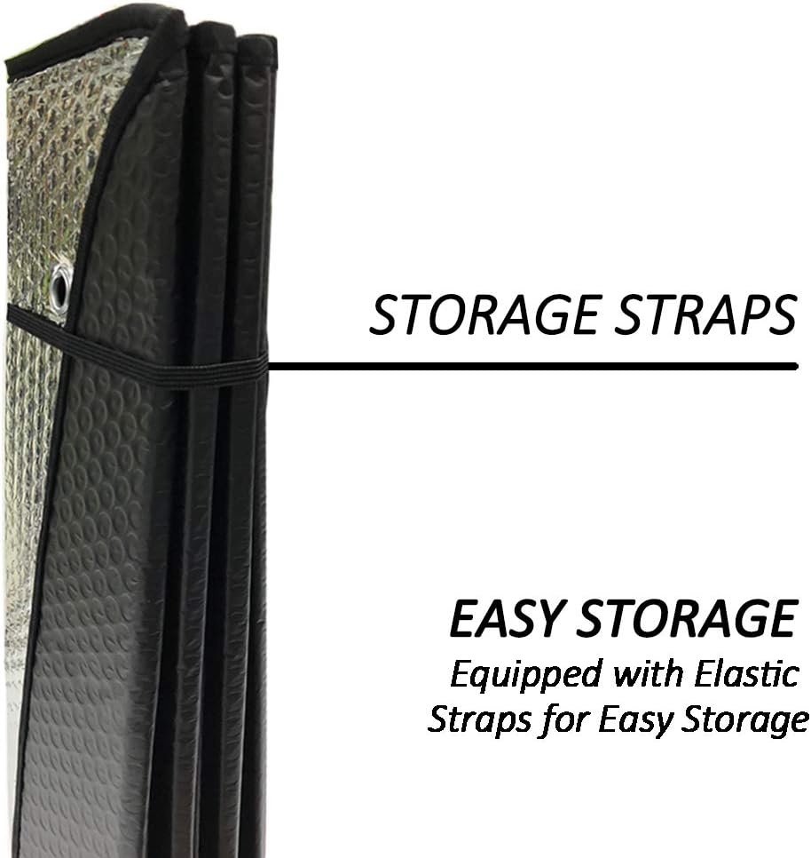 Double Bubble Silver Coated – Keep from 99% UV Ray Damage,windshield sun shade is a great barrier for hot sun! Keep cool on your car seat or dashboard,bring your interior as new! Auto front sun shade maintains elegant Interior with black design. For driver in summer, sun shade car/ car sun shade for windshield as a good helper!