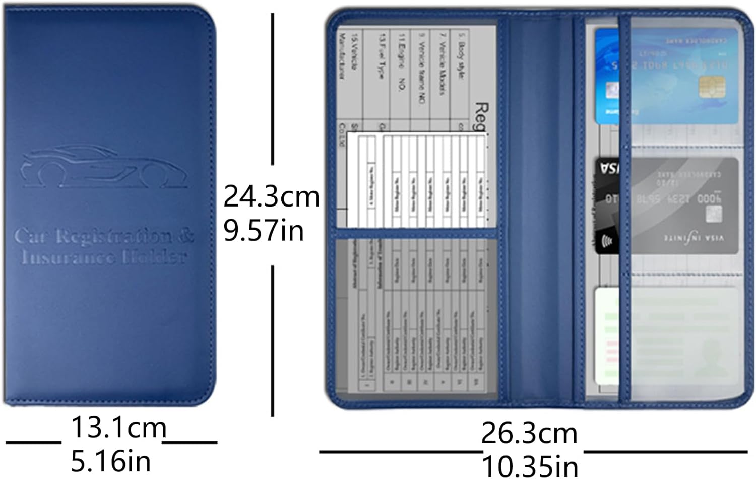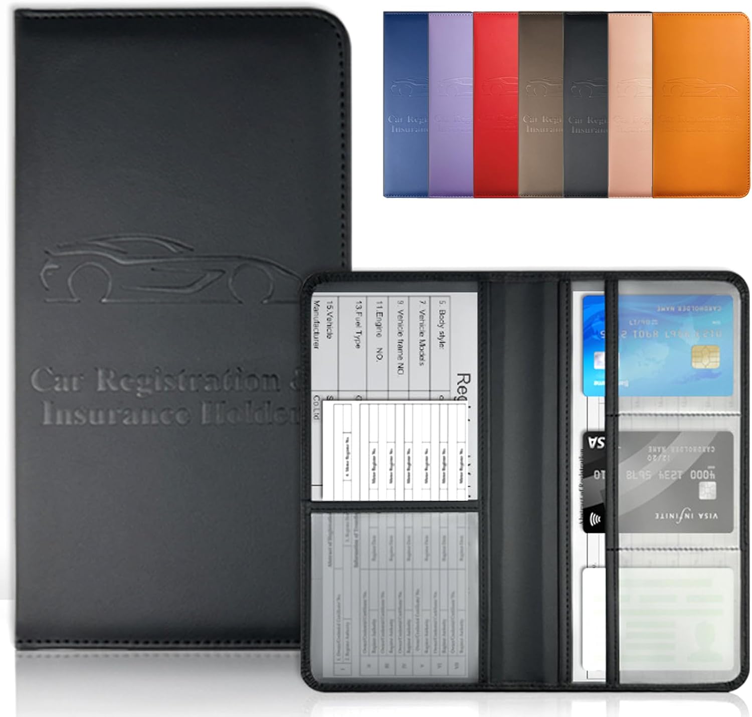 The car registration & insurance card holder is a compact organizer designed to keep your vehicle documents and cards organized in your glove compartment. Key Features of this car document holder: 1. Compact dimensions of this car document holder : 9.57″ x 5.16″ x 0.2″ – fits perfectly in most glove boxes; 2. This car registration and insurance holder is built-in magnetic closure for convenient and secure document storage; 3. This registration and insurance card holder has multiple compartments to separate registration, insurance, and other vehicle documents 4. Durable construction protects important papers from damage 5. Universal compatibility works in cars, trucks, and SUVs 6. This car registration holder is available in 6 colors: Blue, Black, Brown, Orange, Purple, and Red At just $5.99, this car document organizer helps you keep essential vehicle documents easily accessible while maintaining a tidy glove compartment Fit standard glove compartments and feature clear windows for easy document identification. The premium options offer magnetic closures and luxury materials, while budget options provide excellent value with reliable protection.