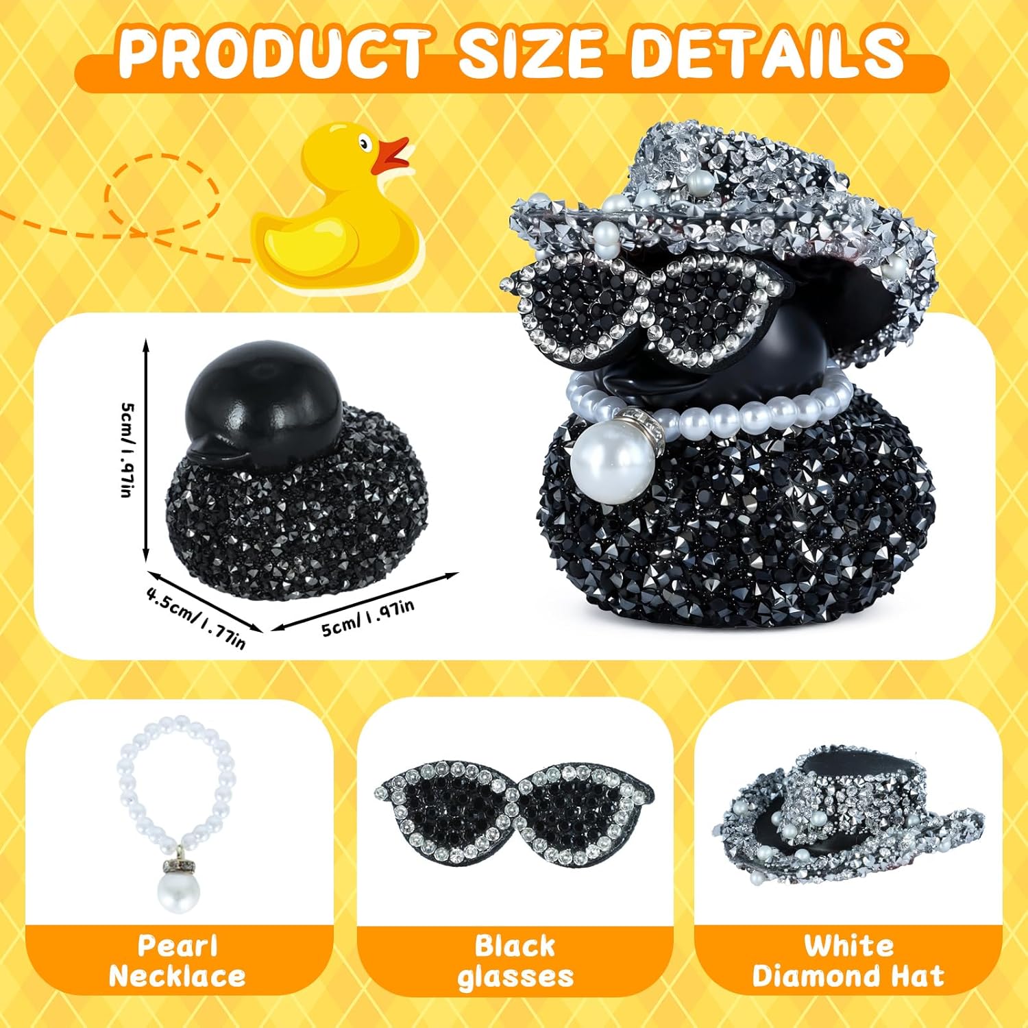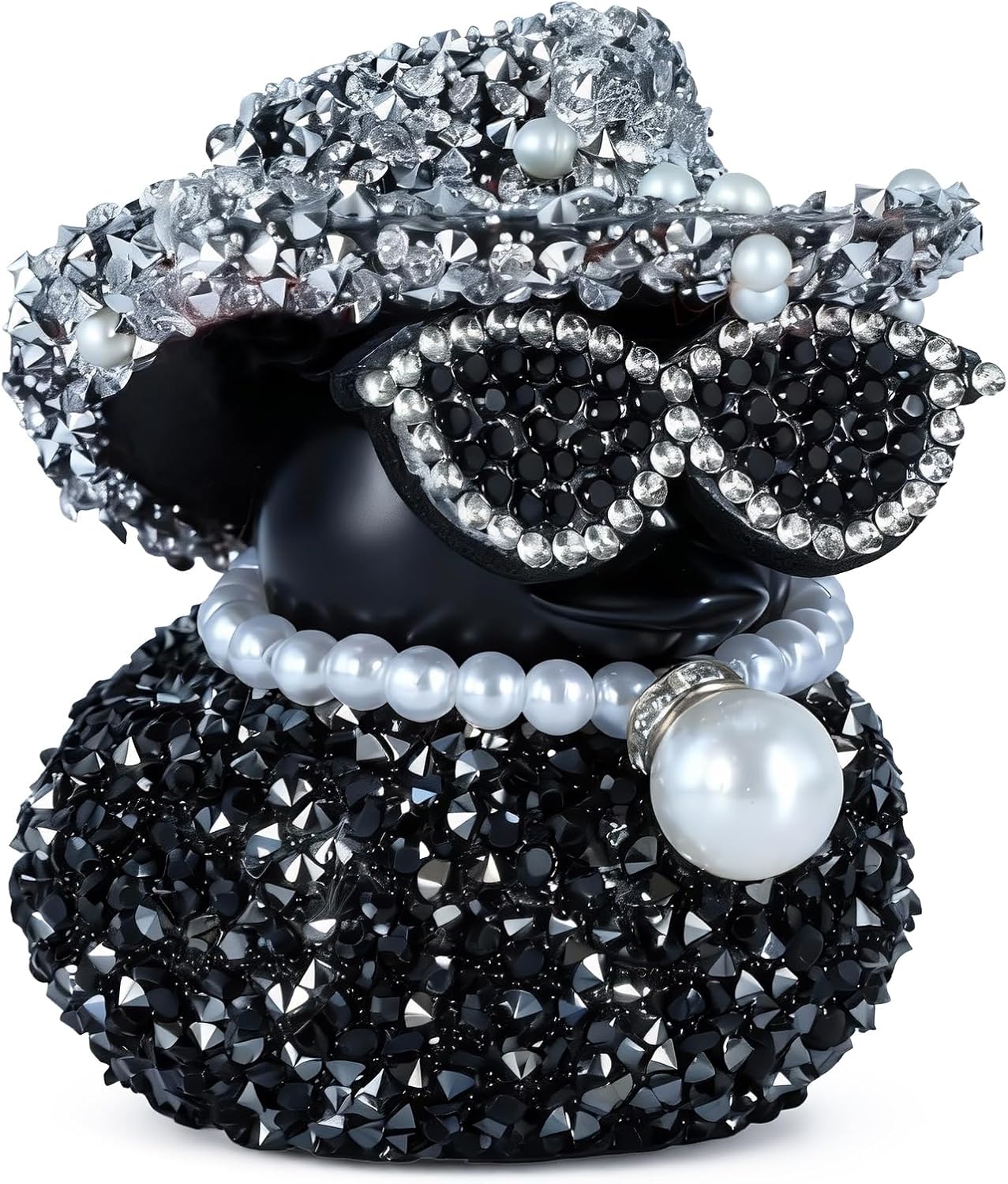 Black Diamond Rubber Duck with White Diamond Hat, Sunglasses & Pearl Necklace – Funny Car Dashboard Decor Accessory, Premium PVC Material