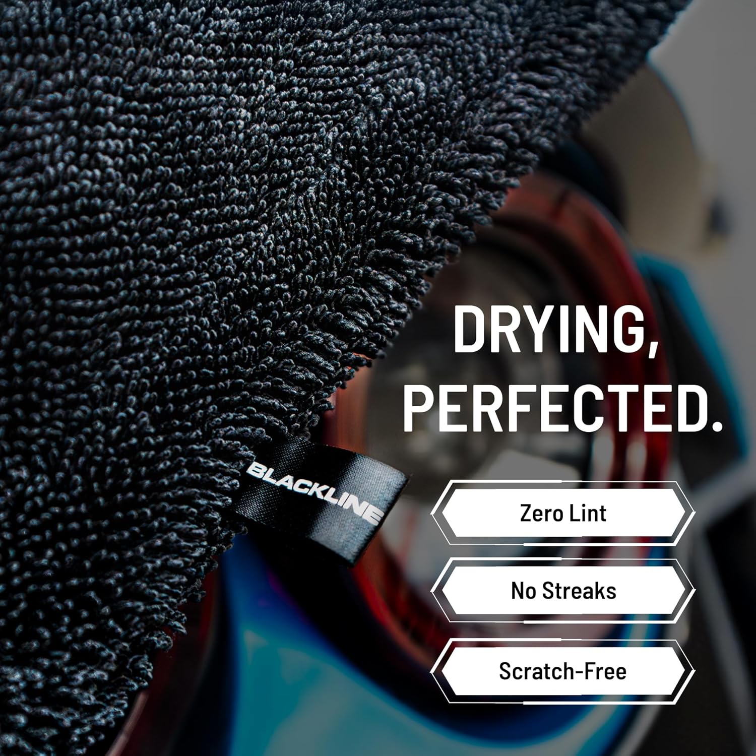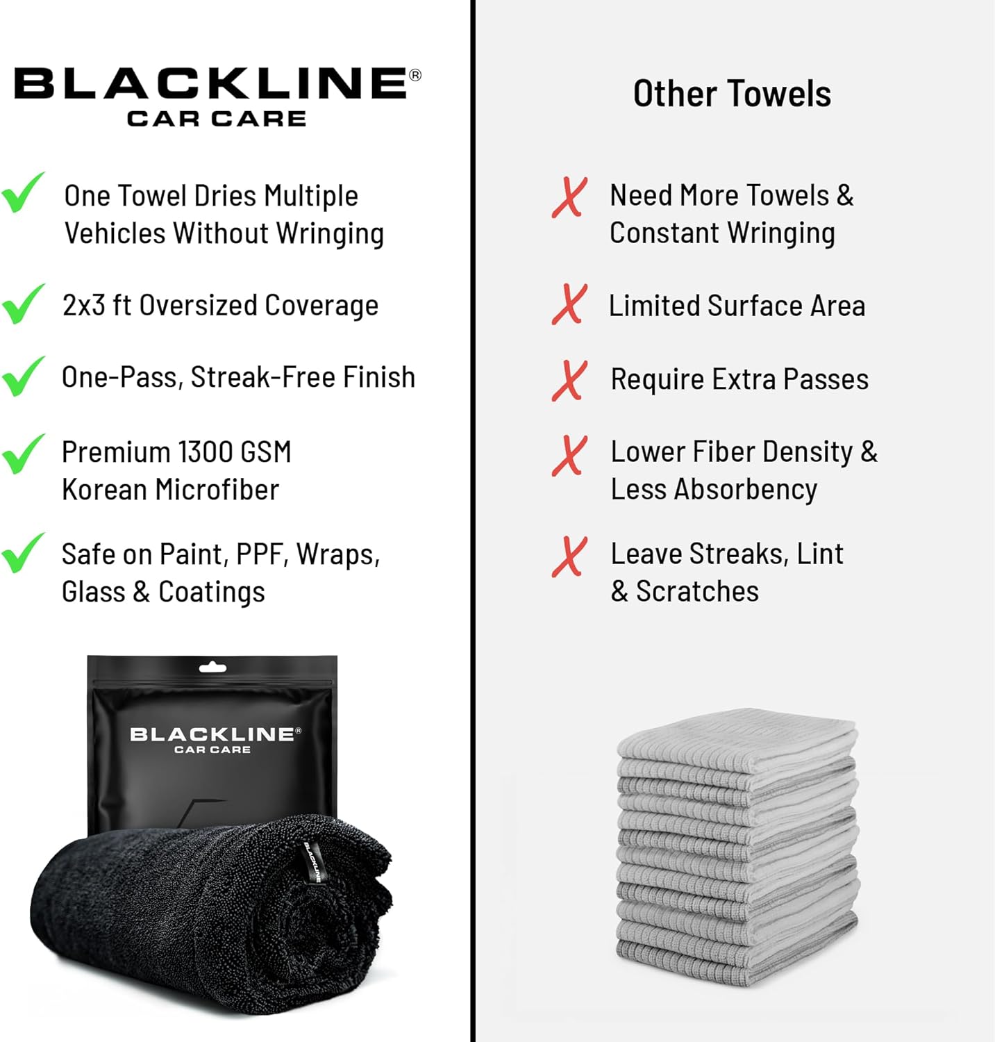 Overall:The Blackline Drying Towel is an excellent car drying tool. It’s highly absorbent, incredibly soft, and delivers a streak-free finish. While it’s a bit pricier than some alternatives, the superior performance and quality make it a worthwhile investment for anyone serious about car detailing. If you’re looking for a top-tier drying towel, I highly recommend the Blackline. It has definitely earned a place in my car care arsenal.Pros:Absorbency: This towel is seriously thirsty! The 1300 GSM (grams per square meter) rating definitely lives up to the hype. It soaks up a ton of water, making quick work of drying even large vehicles. I found I needed to wring it out far less frequently than with other microfiber towels I’ve used.Size: The XL size is fantastic. It’s big enough to cover a large area quickly, reducing the number of passes needed and making the drying process much more efficient. It also makes it easier to handle and fold.Softness: The microfiber is incredibly soft and plush. I was initially worried about scratching my paint, but this towel glided smoothly and left a streak-free finish. Even after several washes, it remains soft and gentle.Streak-Free Drying: This is perhaps the most important factor, and the Blackline towel delivers. I’ve been very impressed with how effectively it dries my car without leaving streaks or water spots.Quality: The construction feels solid and durable. The stitching seems well done, and the towel has held up well through multiple washes. It feels like a premium product.Cons:Price: Compared to some other microfiber towels, the Blackline is a bit more expensive. However, in my opinion, the performance and quality justify the cost. You get what you pay for.Care: Like most high-quality microfiber towels, it requires specific care. You need to avoid fabric softeners and wash it separately to maintain its absorbency and softness. This isn’t a huge drawback, but something to be aware of.