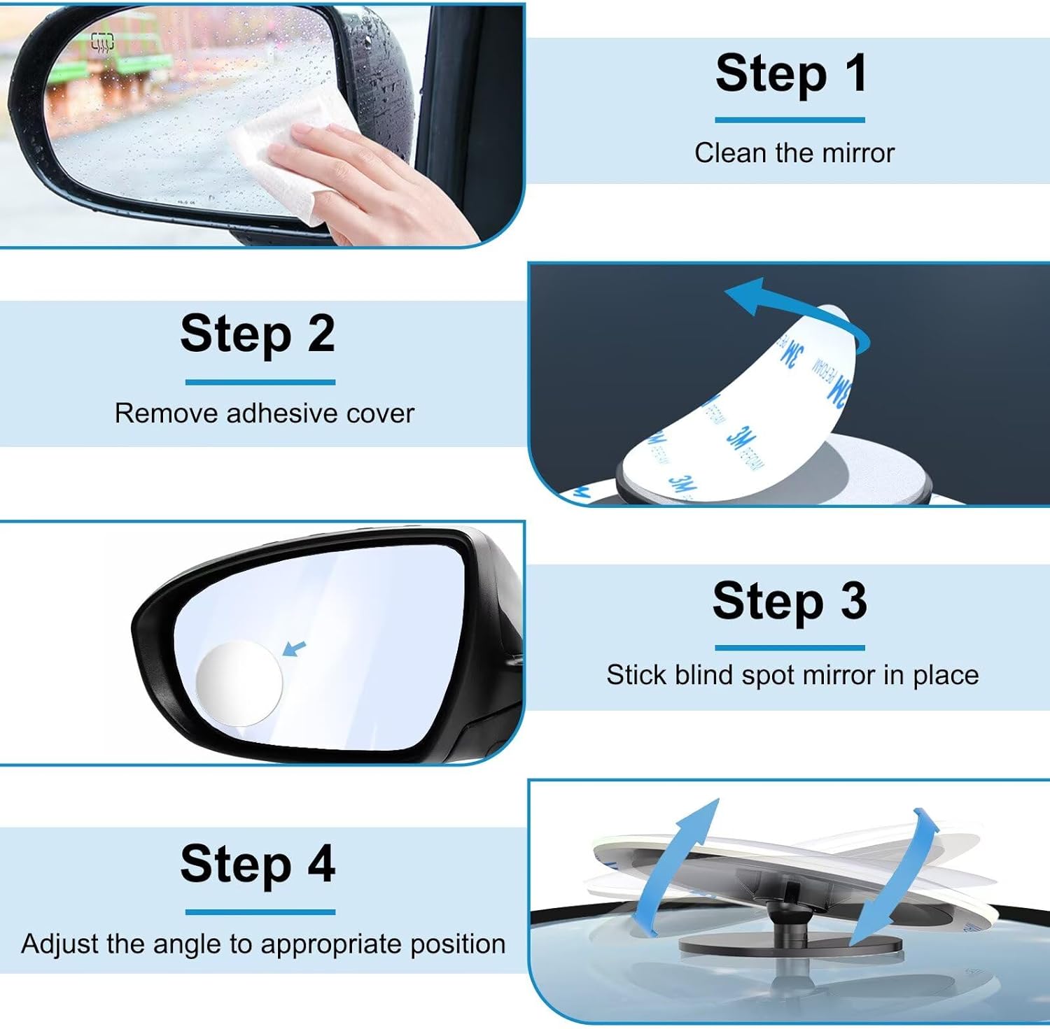 Easy installation:Please clean and dry the original rearview mirror, remove the adhesive cover, stick the blind spot mirror on the rearview mirror and press firmly to make sure the pressure-sensitive adhesive works, you can choose to install an adjustable device if necessary