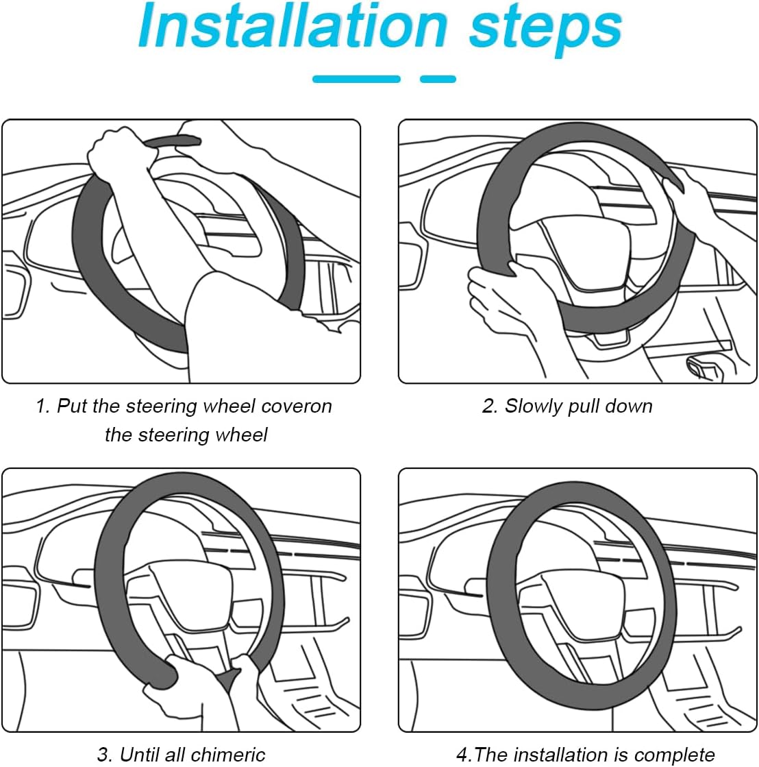 Easy Installation: This product is very easy to install, no inner ring, retractable design can be directly set on the steering wheel. First align the top of the steering wheel cover above the steering wheel, then stretch down to cover both sides, and finally stretch the bottom part hard to completely cover the bottom of the steering wheel, use its elastic band to tighten automatically, no need to disassemble the steering wheel, a single person can quickly complete the installation.