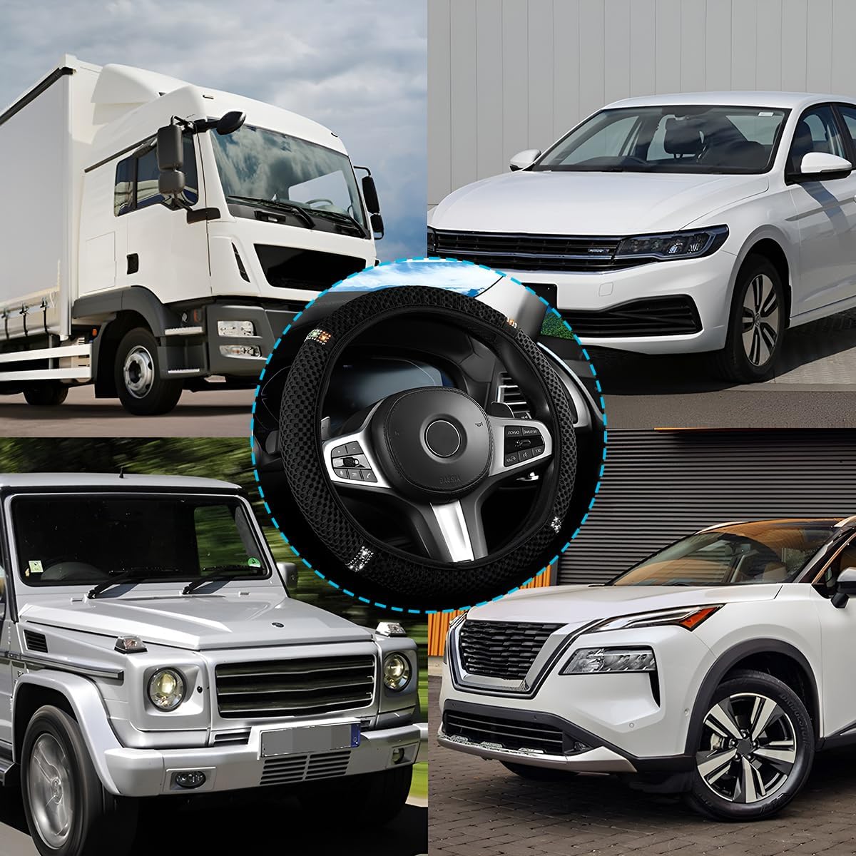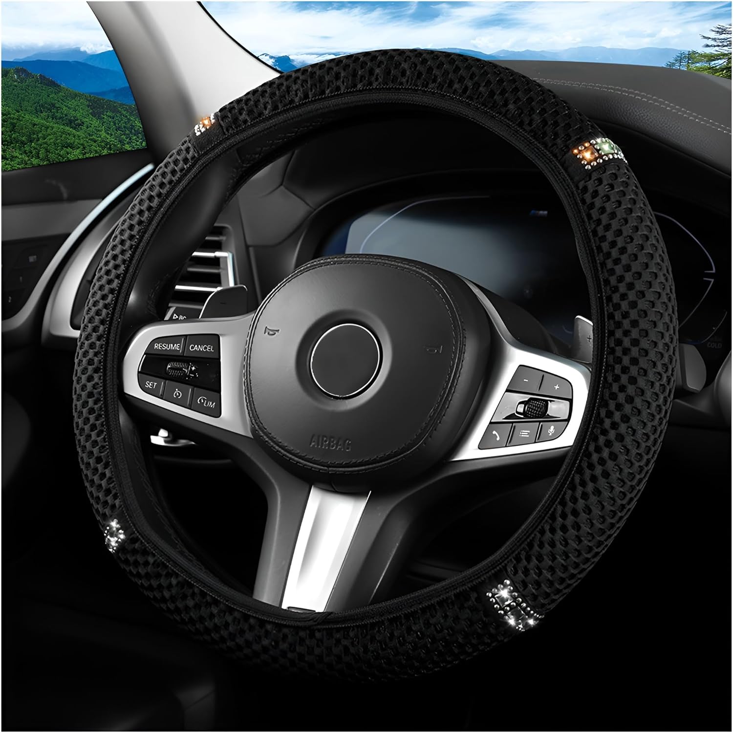 High Quality Material: Our car steering wheel cover is made of high quality ice silk mesh fabric and rhinestone material. Ice mesh has good heat dissipation properties, breathable and dry, avoiding slippage caused by sweating. Ice mesh fabric is soft and skin-friendly, wear-resistant and durable, able to withstand frequent daily use and all kinds of friction. The rhinestones are brilliant in the light, enhancing the beauty and texture of the car interior.