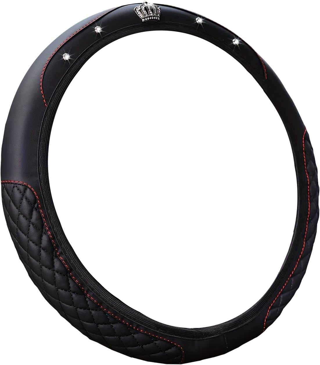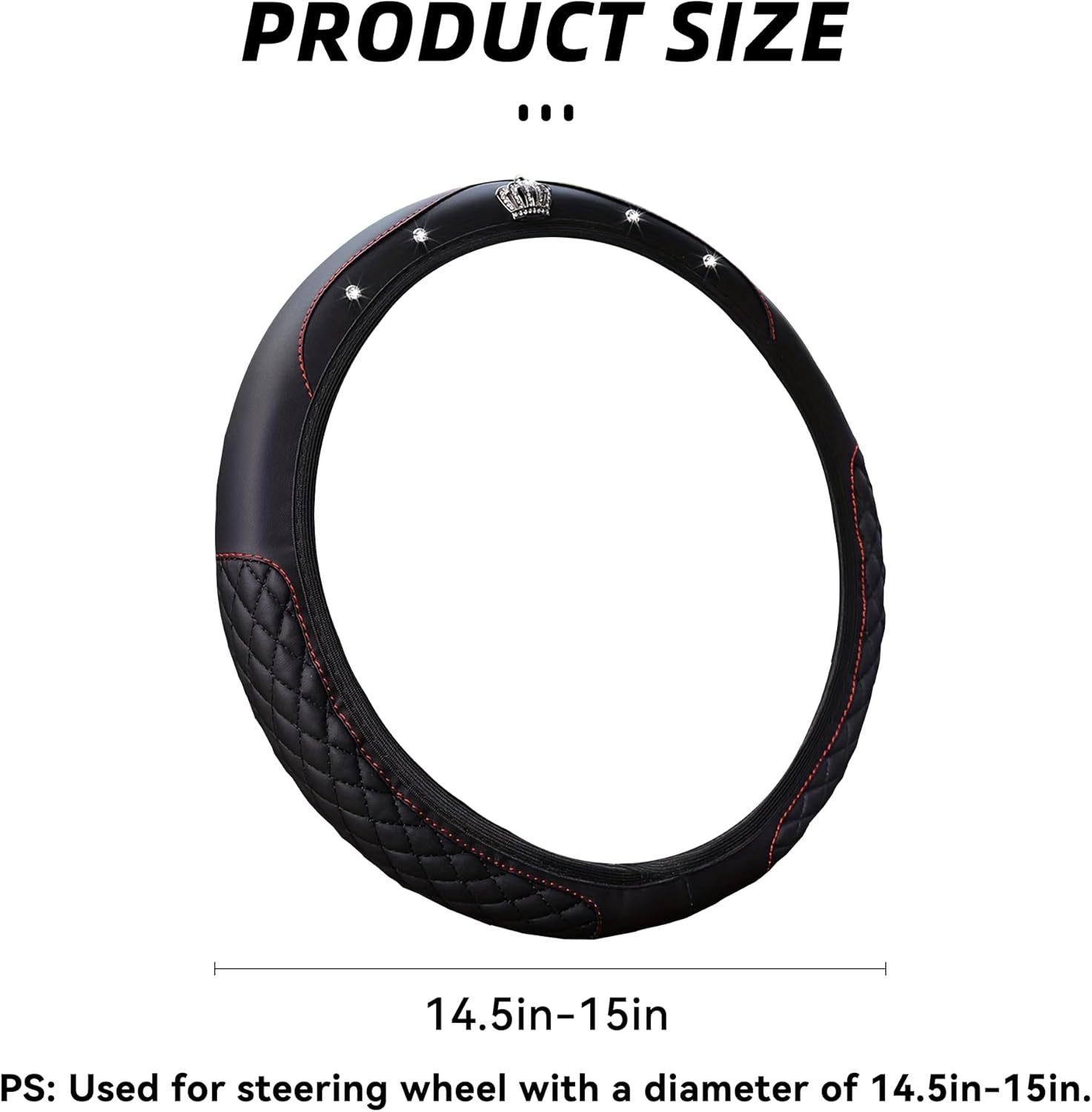 【Premium Materials】: Crafted from premium leather and adorned with sparkling crystals, our steering wheel cover seamlessly blends luxury with functionality. The high-quality leather ensures a soft, comfortable grip, while the shimmering crystals add an elegant, sophisticated touch. Durable materials withstand wear and tear, adding lasting brilliance to your vehicle’s interior.