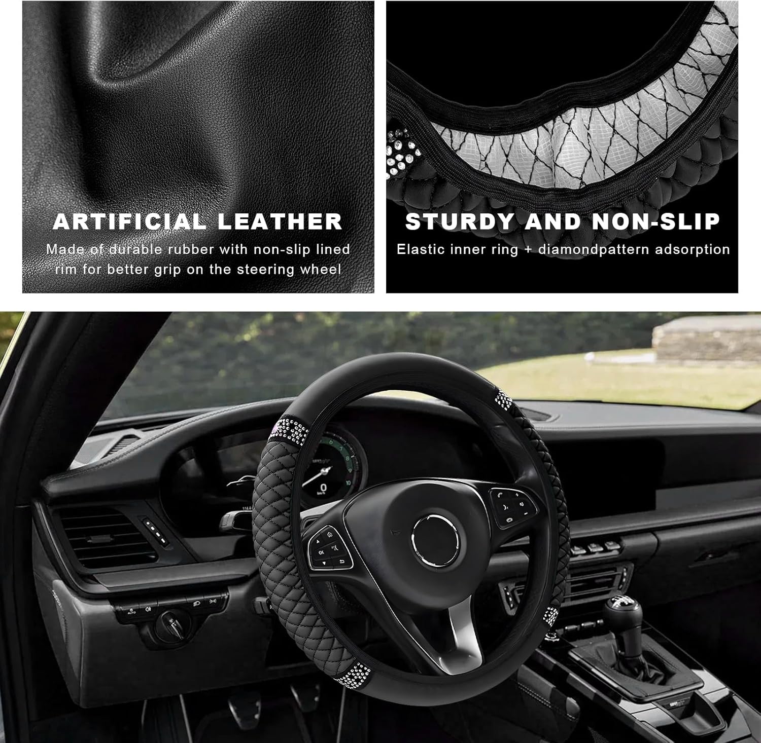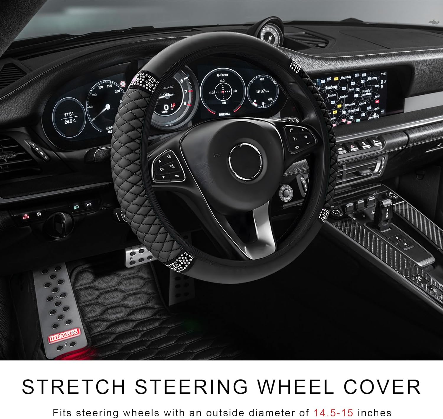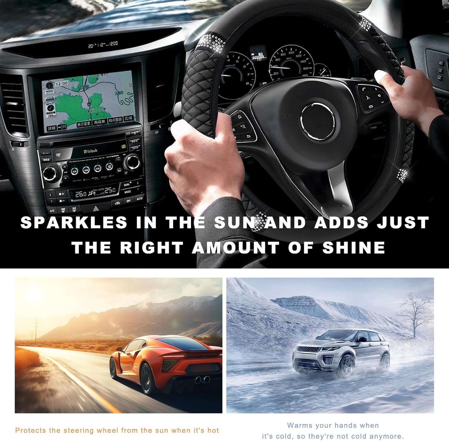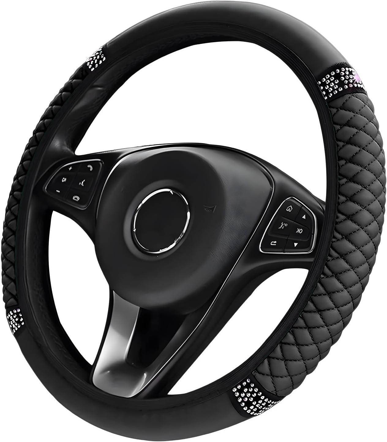 I absolutely love this steering wheel cover! It adds the perfect amount of “bling” to my car’s interior without being too over-the-top. The rhinestones catch the light beautifully through the windshield, especially in the sun. Beyond just looking great, it feels high-quality. The soft leather is comfortable to hold, and the raised rhinestones actually provide a nice grip and massage-like feel for my palms during long drives. It also helps keep the wheel from getting too hot in the summer or too cold in the winter. Installation was straightforward and it fits snugly on my standard 15-inch wheel. Highly recommend if you want to upgrade your car’s look and comfort!