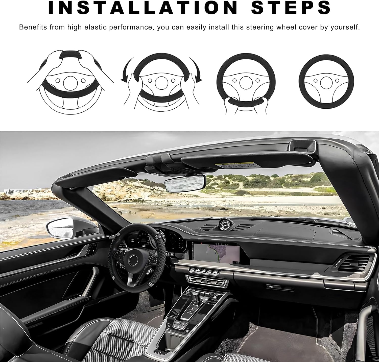 Quick Installation: The car steering wheel cover can be easily installed without any tools. First, place the cover on top of the steering wheel. Slowly lower the cover from both sides to the bottom. Finally, flip the cover over and adjust it lightly so that it fits firmly on the steering wheel