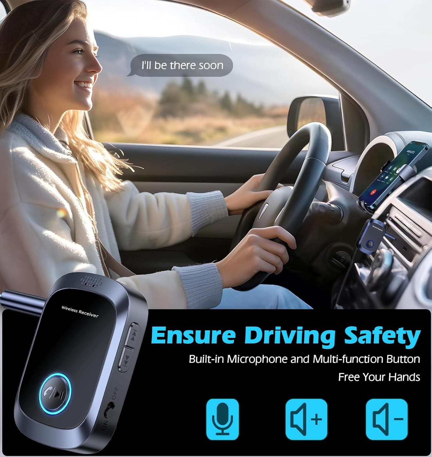EFFORTLESS CONTROL: Easily control your music without touching your phone. Use the +/- buttons to skip tracks or adjust volume. A 3-second hold adjusts the car’s Bluetooth receiver volume, the car aux Bluetooth adapter providing a safe and seamless driving experience.