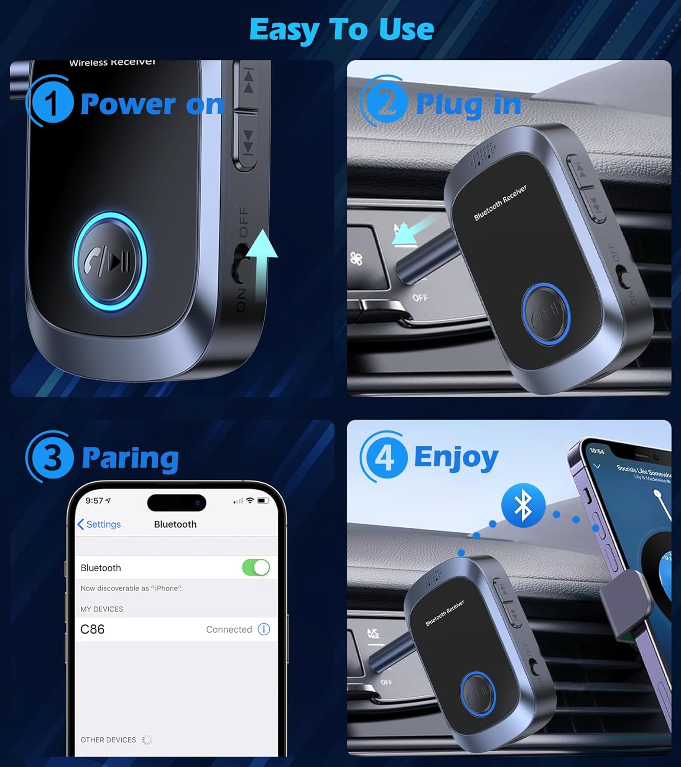 SET UP IN 5 SECONDS FLAT: ①Plug into your car’s aux port (or home stereo). ②Slide the wireless Bluetooth car adapter to “ON.” ③Search “C86” on your phone and connect. It’s that easy!