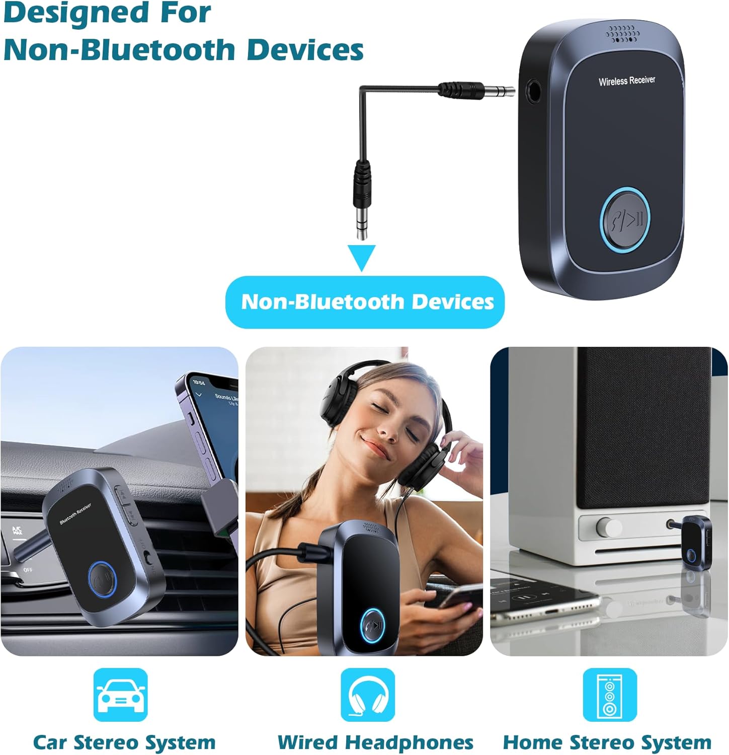 CONCERT-LIKE HI-FI SOUND & FAST PAIRING: Aux to Bluetooth adapter Equipped with advanced Bluetooth 5.4 technology for a stable, skip-free audio experience. Enjoy lightning-fast pairing, an extended 33ft range, and crystal-clear sound that makes every commute feel like a live concert.