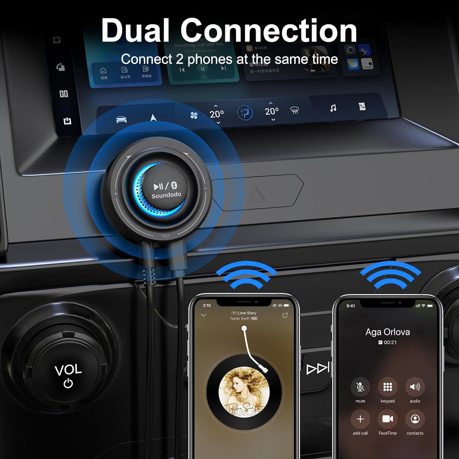 【Dual Connection】Car bluetooth adapter support to connect 2 phones simultaneously. So you won’t worry miss any calls when listening to music. Note: When pairing two devices at the same time, please pause the player on one device and play music on the other device