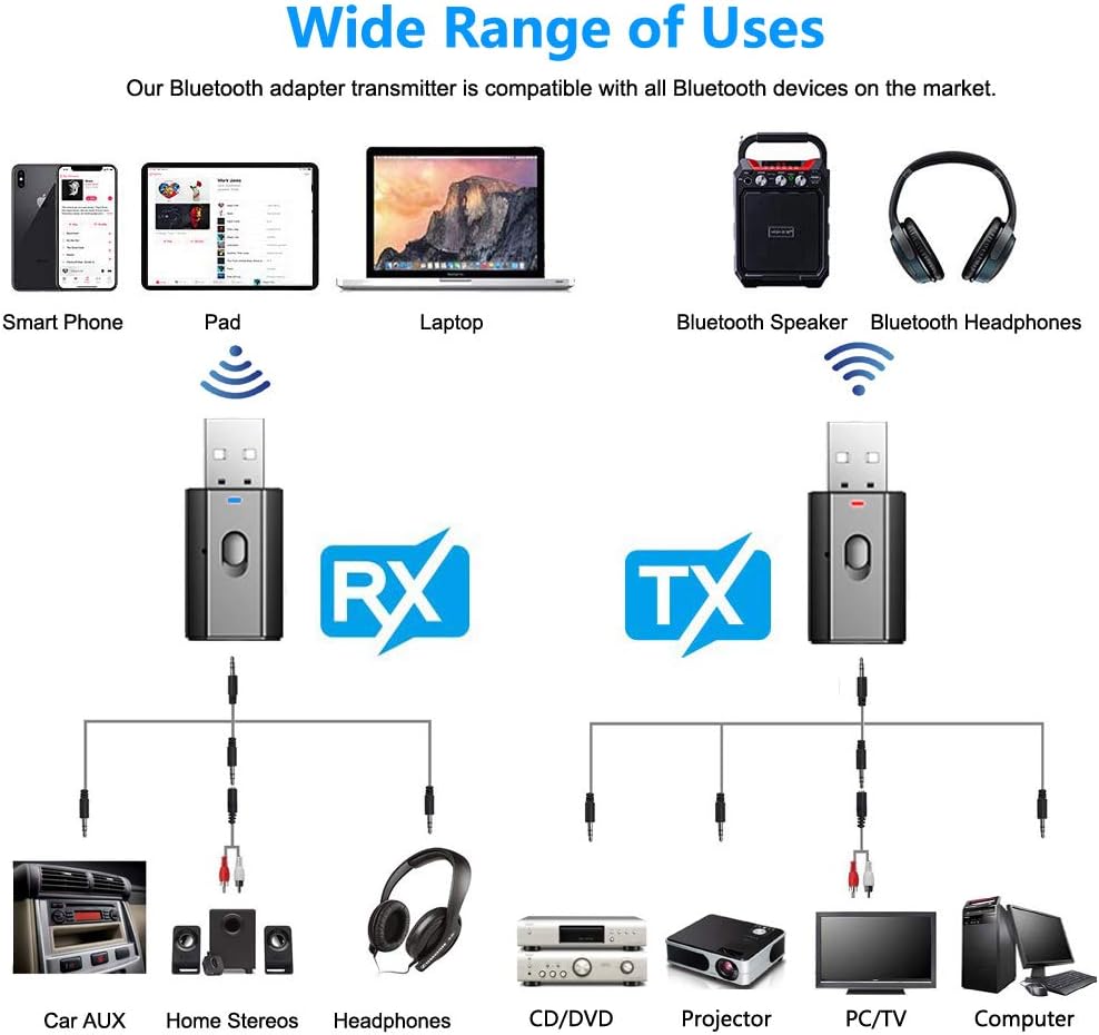 Easy to Use & Widely Compatible: Just plug the 3.5mm AUX cable into the adapter and plug it into the aux jack of your device, switch to the mode you need (RX/TX) and you can use it easily. Widely support all Bluetooth devices (for example: iPhone, iPad, iPod, tablet, Samsung and other Andriod smartphones) to pair as a hands-free kit. Very suitable for your old home/car audio system and wired headset/TV/PC etc. Can provide you with high-definition wireless stereo music/hands-free calling