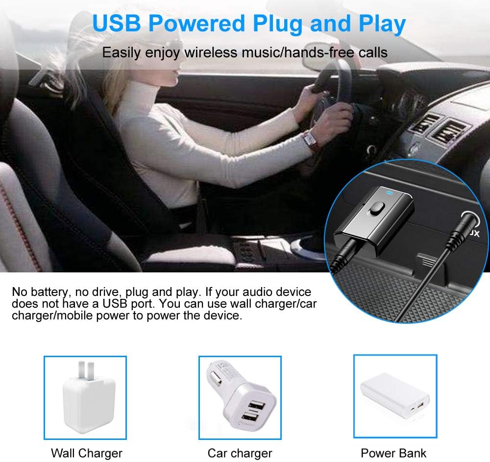Bluetooth Car Adapter, Mini Bluetooth 5.0 Stereo Transmitter Receiver, Wireless 3.5mm Aux Jack Hands-Free Calls Kit Audio Adapter Built-in Mic for Car Speaker, Home Stereo, Headphones, PC,TV More