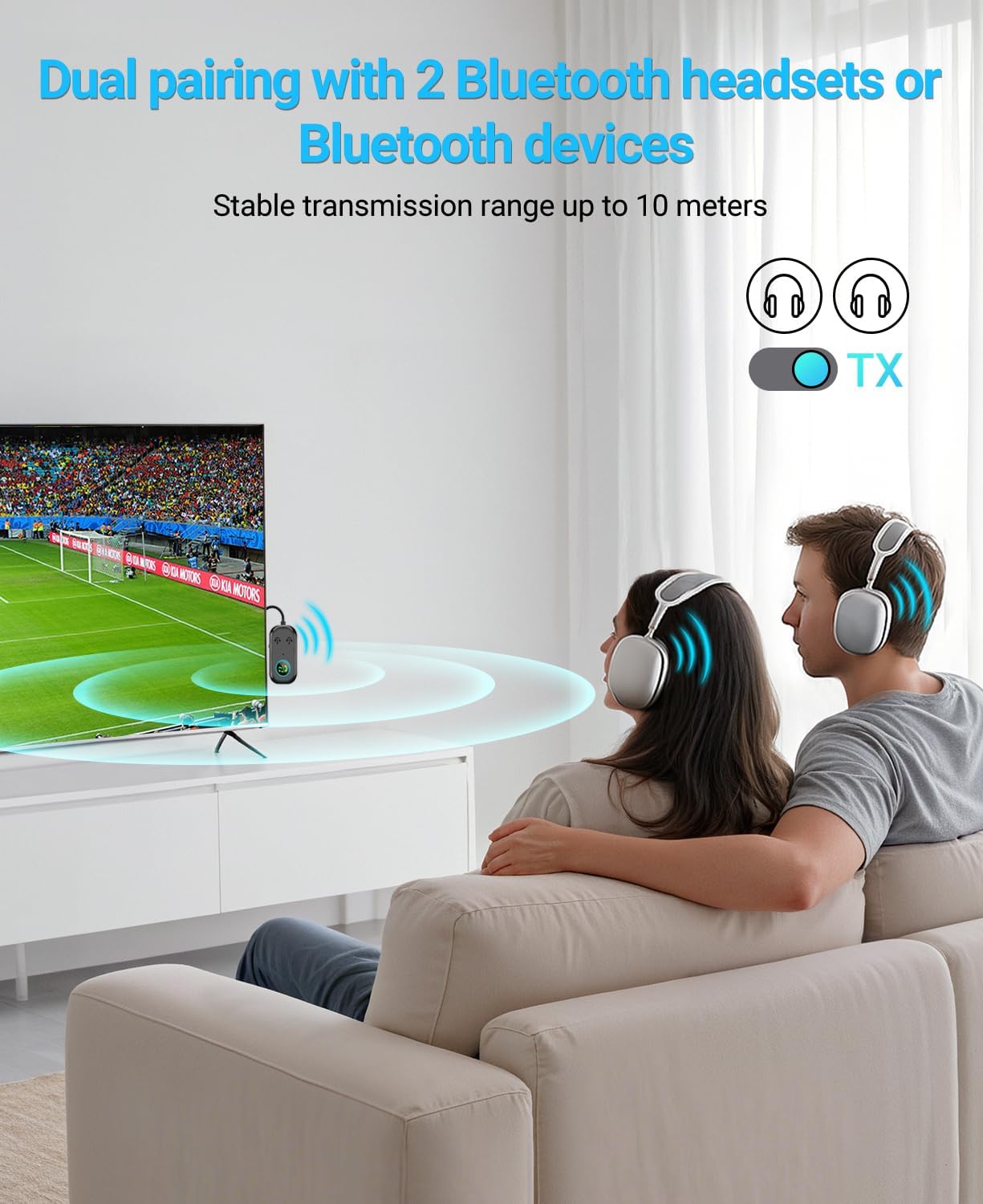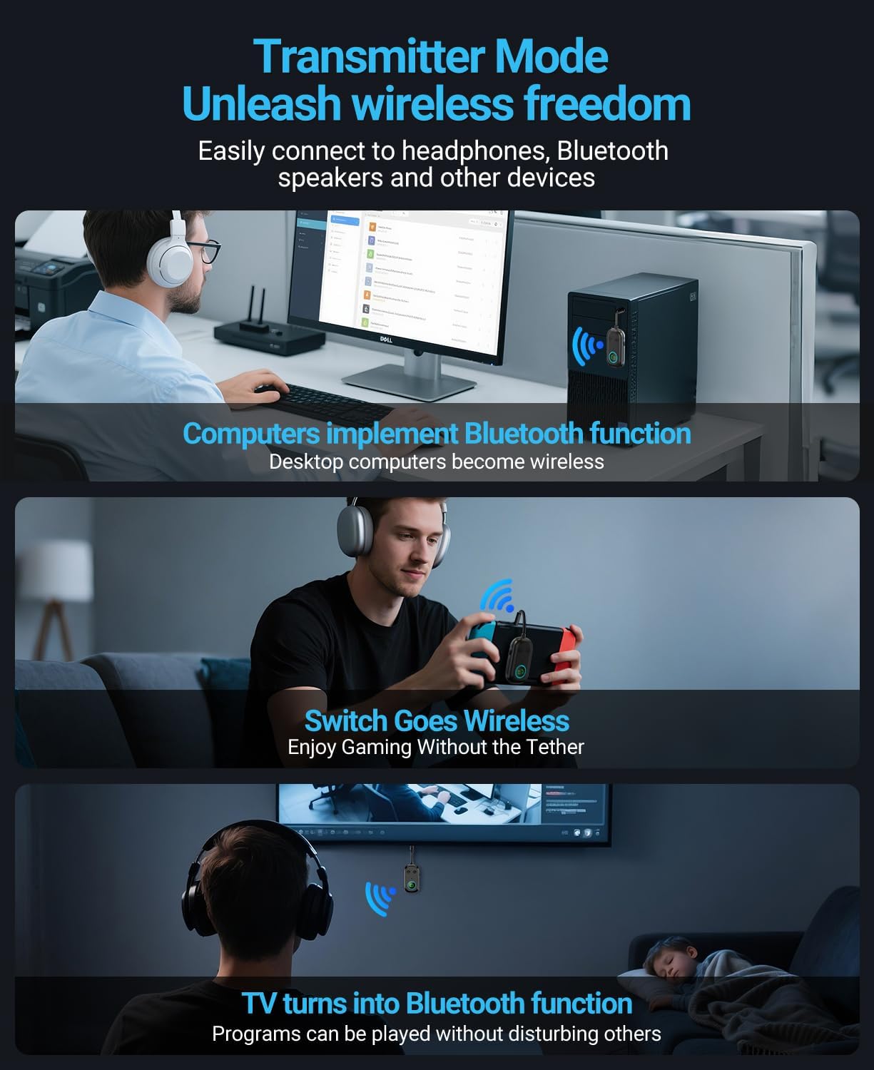Widely compatible, multi-device support: dual bluetooth transmitter compatible with a variety of devices, suitable for Air Pods, headphones, speakers, fitness equipment smartphones, game devices ( PSP, Nintendo Switch), cars, audio, etc., so that every device can enjoy the efficient connection and audio transmission.
