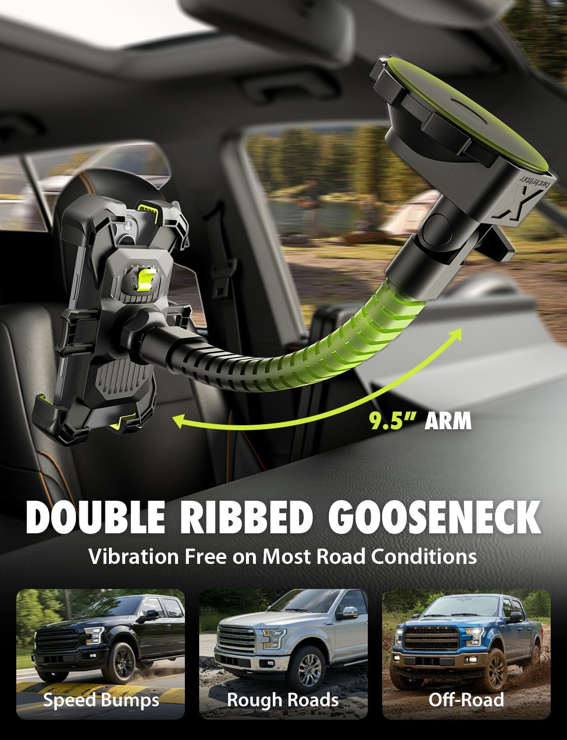 Universal & Durable – Expandable arms fit all phones, even with protective cases. Designed with durable materials and a low-vibration structure, the car phone mount is built tough for daily commutes, road trips, and off-road adventures alike.