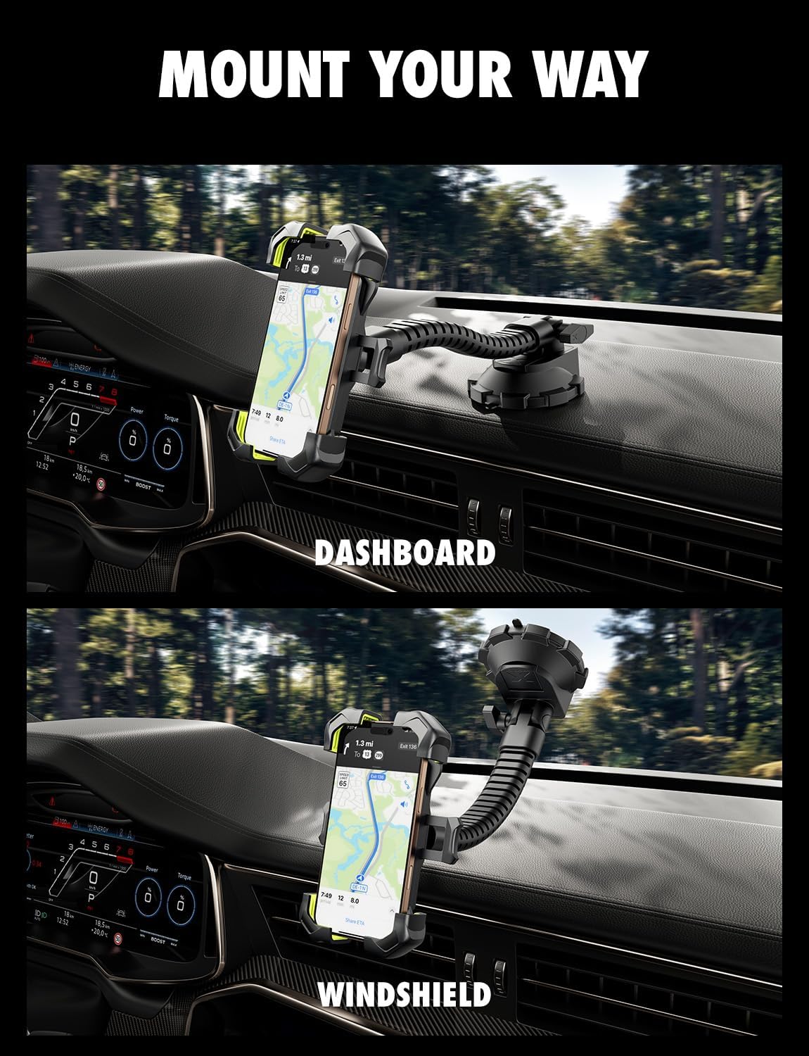 Flexible Gooseneck Arm – The reinforced X-Flex arm bends and rotates 360°, letting you position your phone at the perfect angle. Ideal for GPS navigation, video calls, or music streaming, whether in portrait or landscape mode.