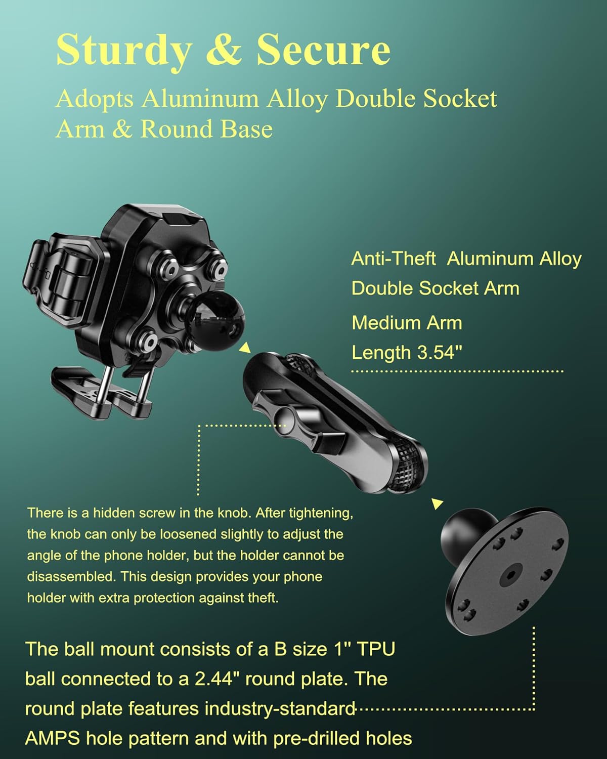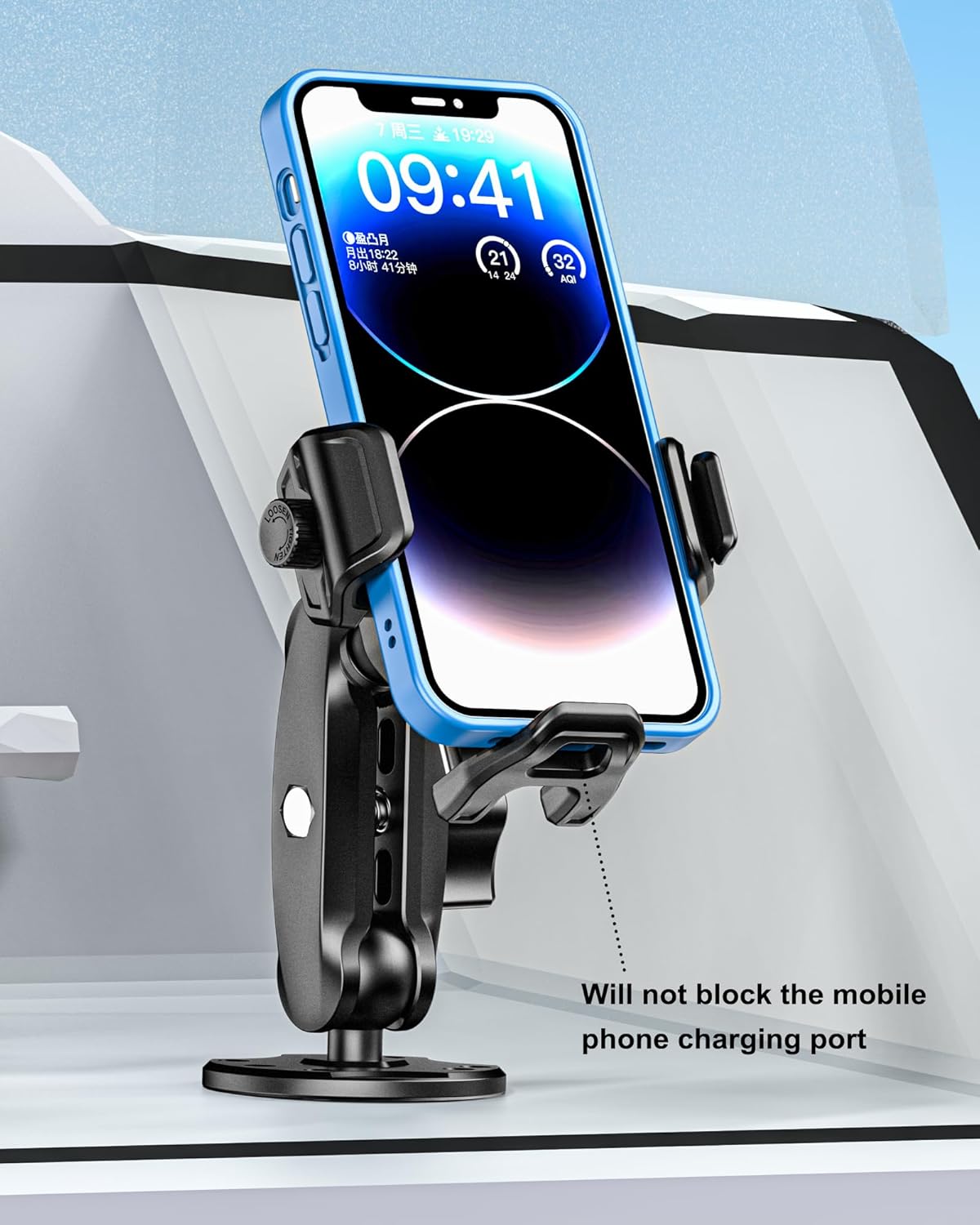 Sturdy & Secure: The main body of this phone cradle is made of high-strength material, adopt solid aluminum round base and medium double socket arm. The all-around rubber pads on phone clip protect your phone from scratching and slipping. Equipped with vibration dampener to absorb vibrations generated while driving