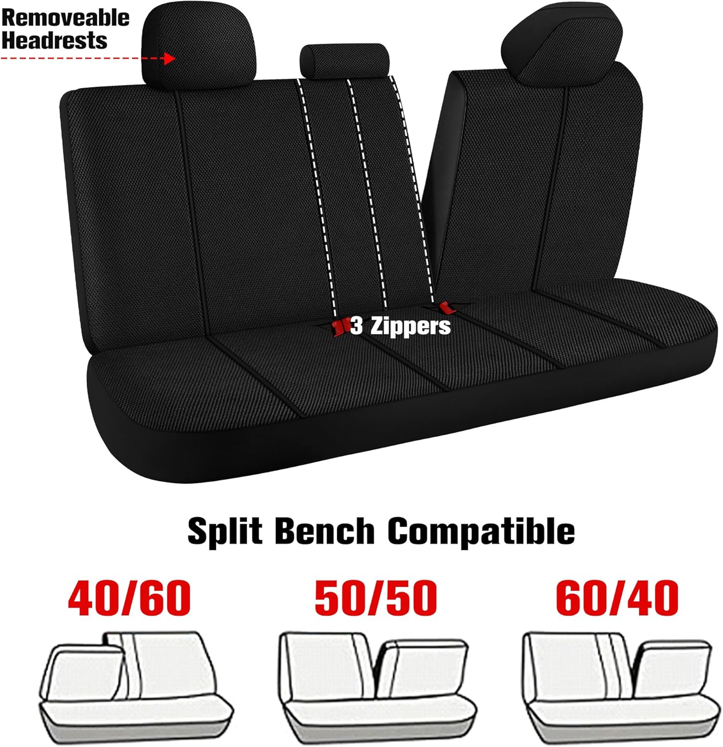 The rear seat features a split bench design with 40/60, 50/50, and 60/40 compatibility, allowing easy use of the rear armrest. Please note, the safety buckle cutout needs to be trimmed for proper fitment.