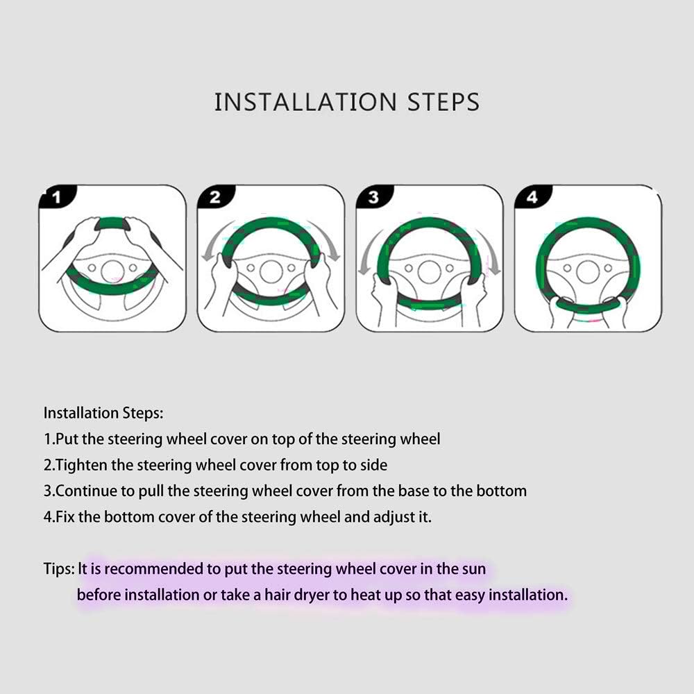 EASY TO INSTALLATION : The steering wheel cover is easy to install, just slide it correctly onto the steering wheel. Just place the cover on top of the steering wheel. Hold the upper part of the lid and use either side of both hands to gradually lower it to tighten. Please see the diagram for details