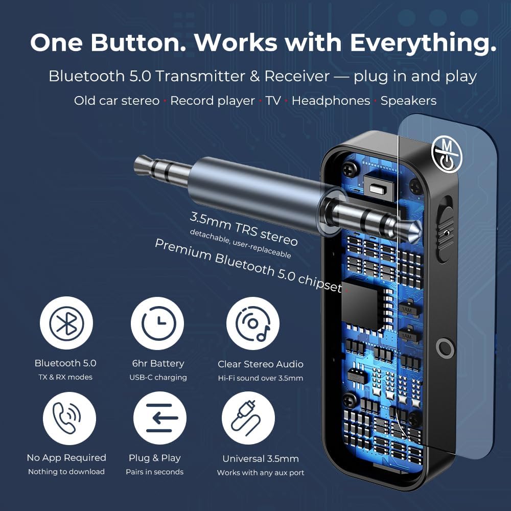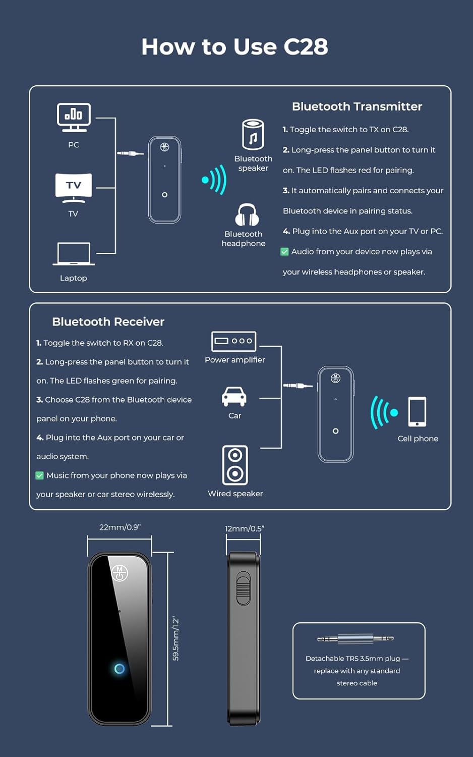 Instant plug-and-play — no app, no menus, no pairing codes: Plug the C28 into any 3.5mm aux jack and it pairs with your AirPods, JBL, Bose, or Sony headphones in seconds. One button switches between transmitter mode (send audio out) and receiver mode (bring audio in). Nothing to configure — ever.