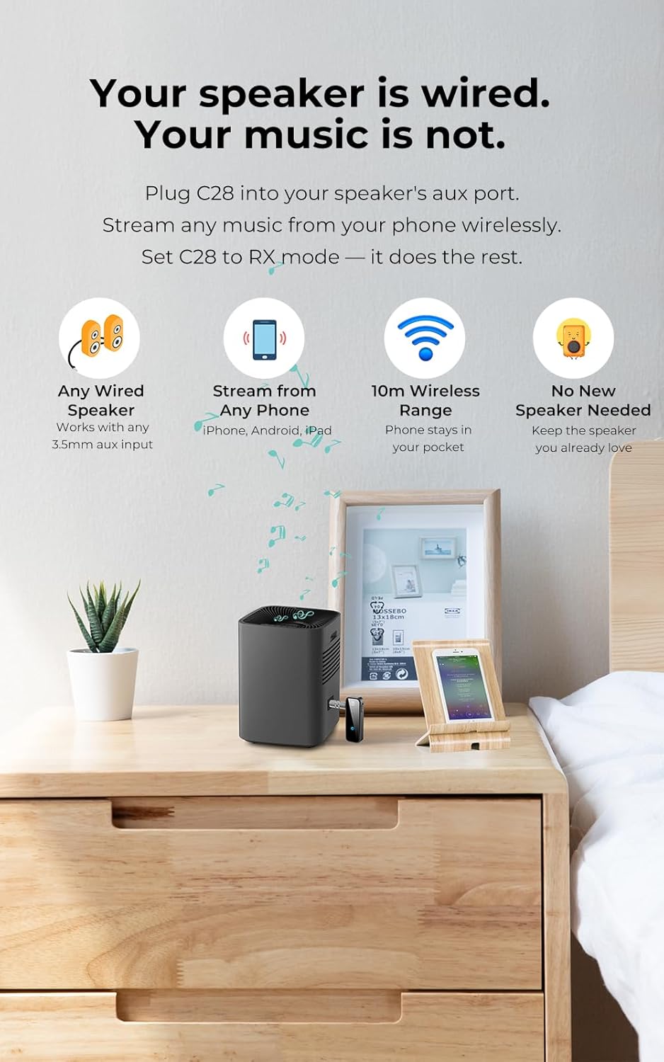 Plug C28 into your wired speaker’s aux input (RX mode). Stream any music from your phone wirelessly — no new speaker required.