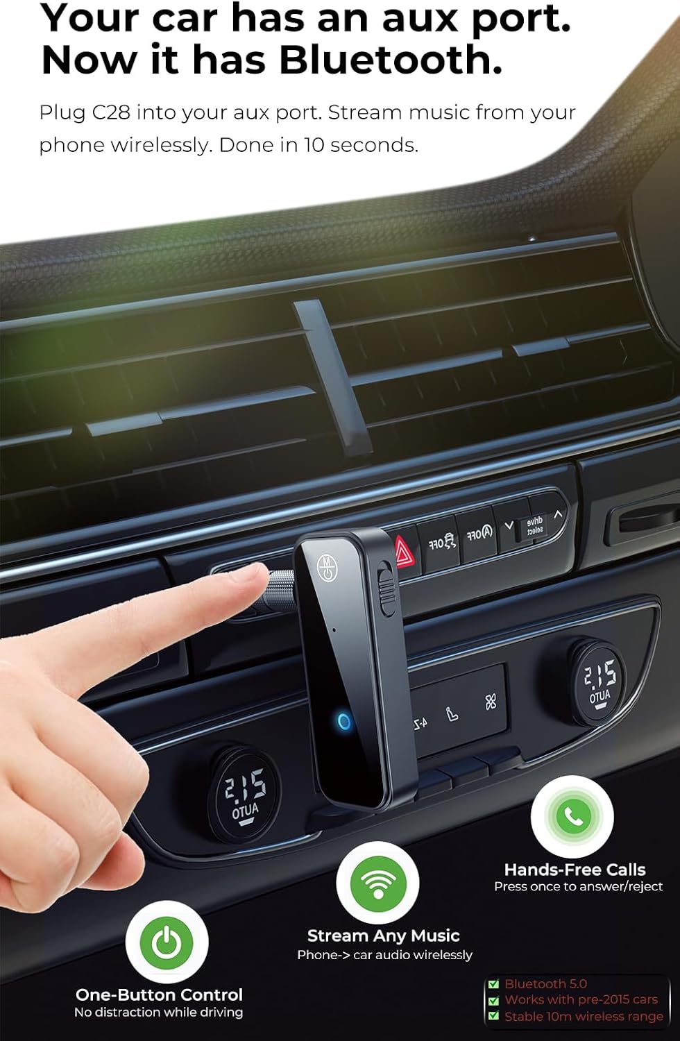 Plug C28 into your aux port (RX mode). Stream music, calls, and navigation from your phone — no built-in Bluetooth needed.