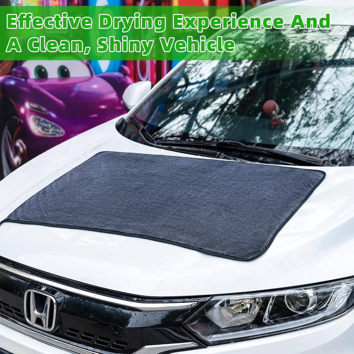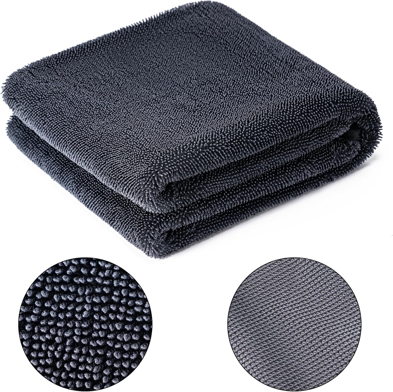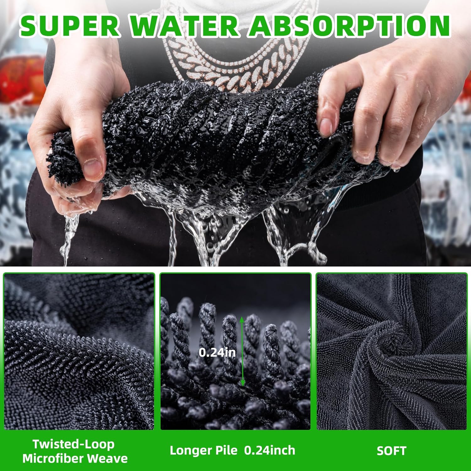 Super Absorbent: Utilizing advanced twisting yarn microfiber technology which work to trap missed dirt and debris deep within its fibers and greatly increase the contact area with water, absorbing tons of water off the surface of any vehicle for a spot-free shine after a wash.