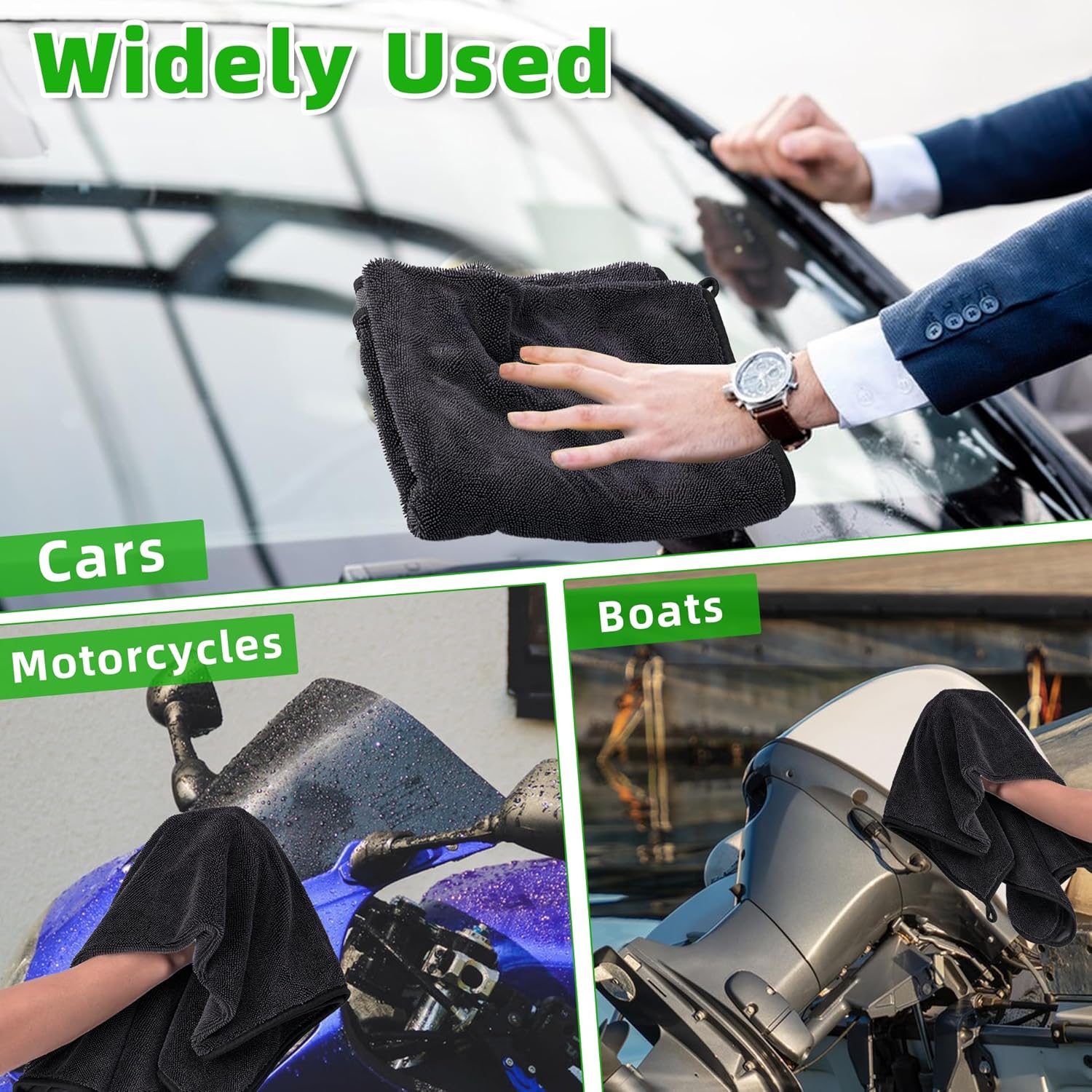 Multi-Purpose Microfiber Cleaning Cloths: Our car wash towel are not only to car polishing, waxing, and cleaning but also great for drying any wet surface around your home such as cleaning trucks, boats, glass, windows, furniture, kitchen appliances, making it ideal for home and vehicle cleaning.