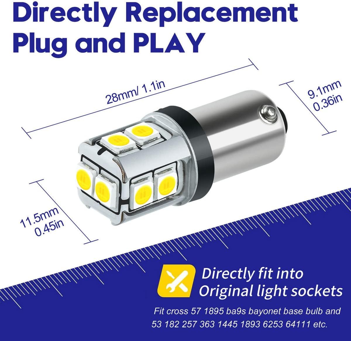 6000K White color , built in CANBUS function, no error, 12-24V DC voltage, made with 10-SMD high power 3030-chipset , super bright 360 launch lighting , made with aluminum housing and smart IC driver, better heat dissipation, and long life