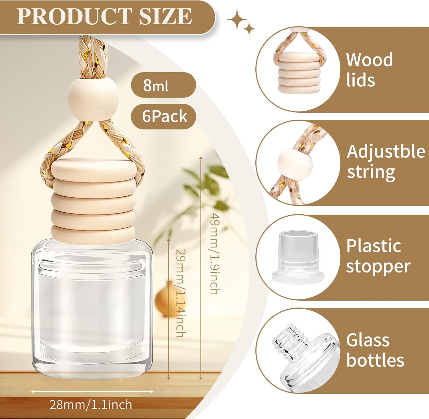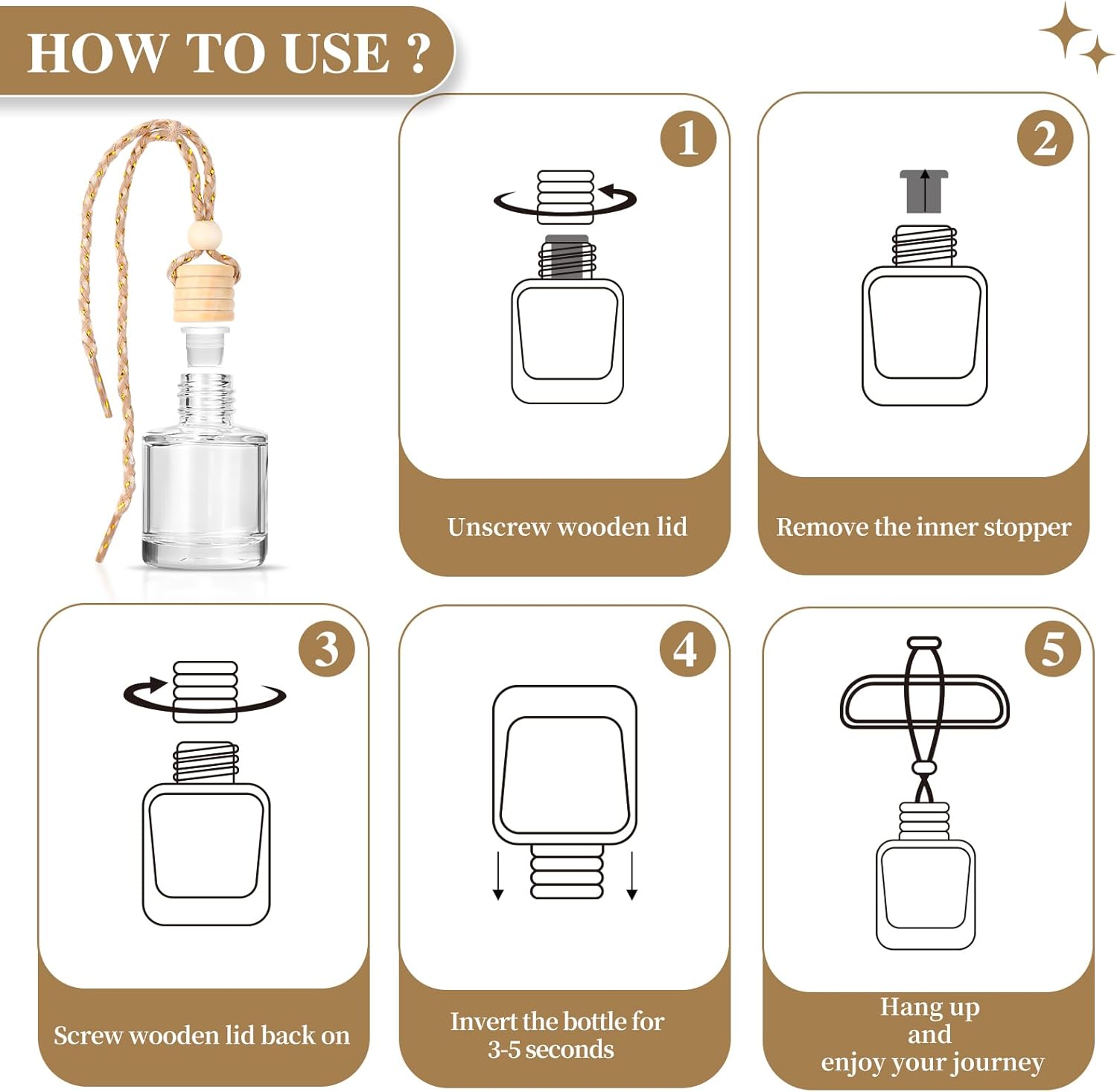 【Easy Installation】1.Unscrew wooden lid 2.Remove plastic stopper 3.Screw wooden lid back on 4.Turn bottle over for 5-8 seconds until the wooden lid absorb fragrance oil 5.Hang on the rearview mirror and adjust the hanging rope