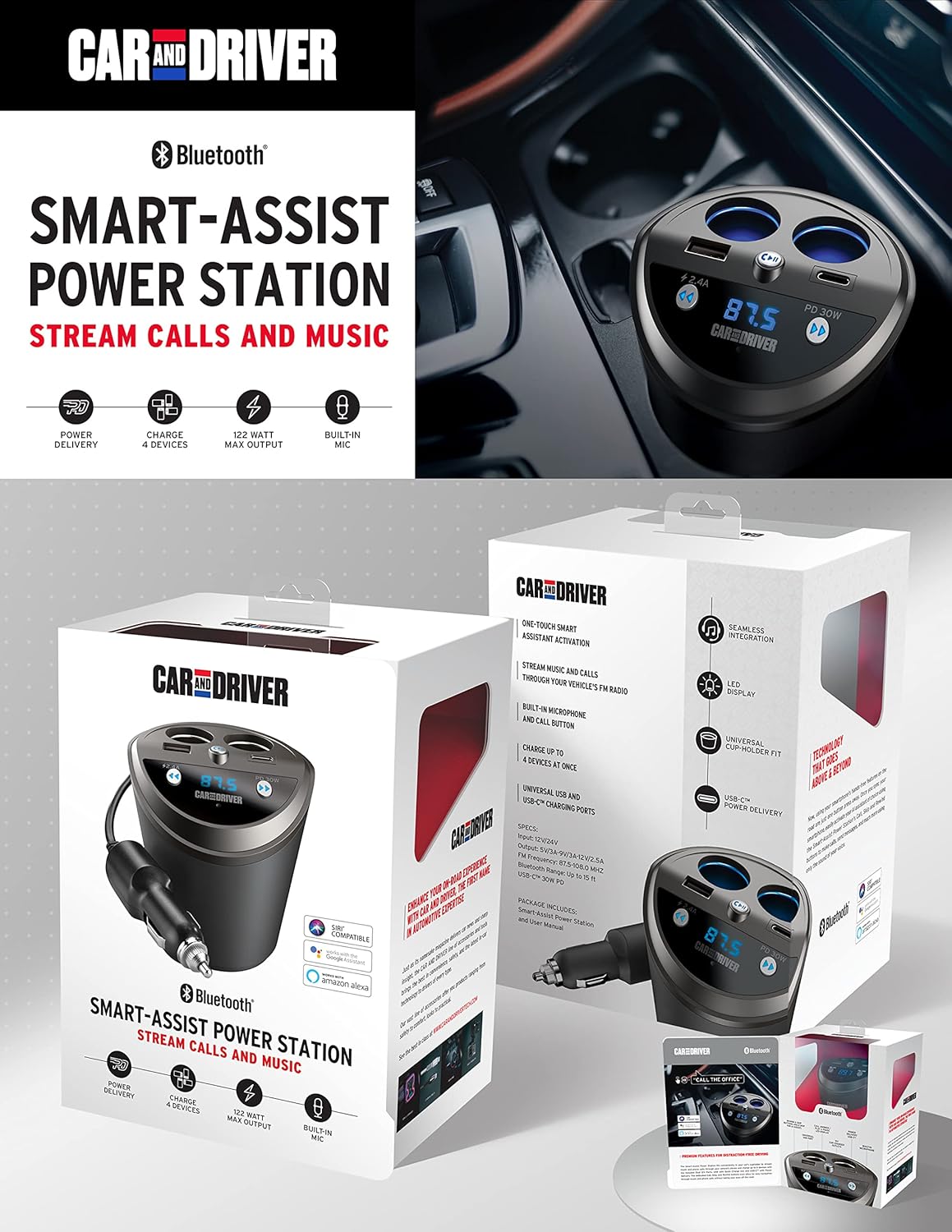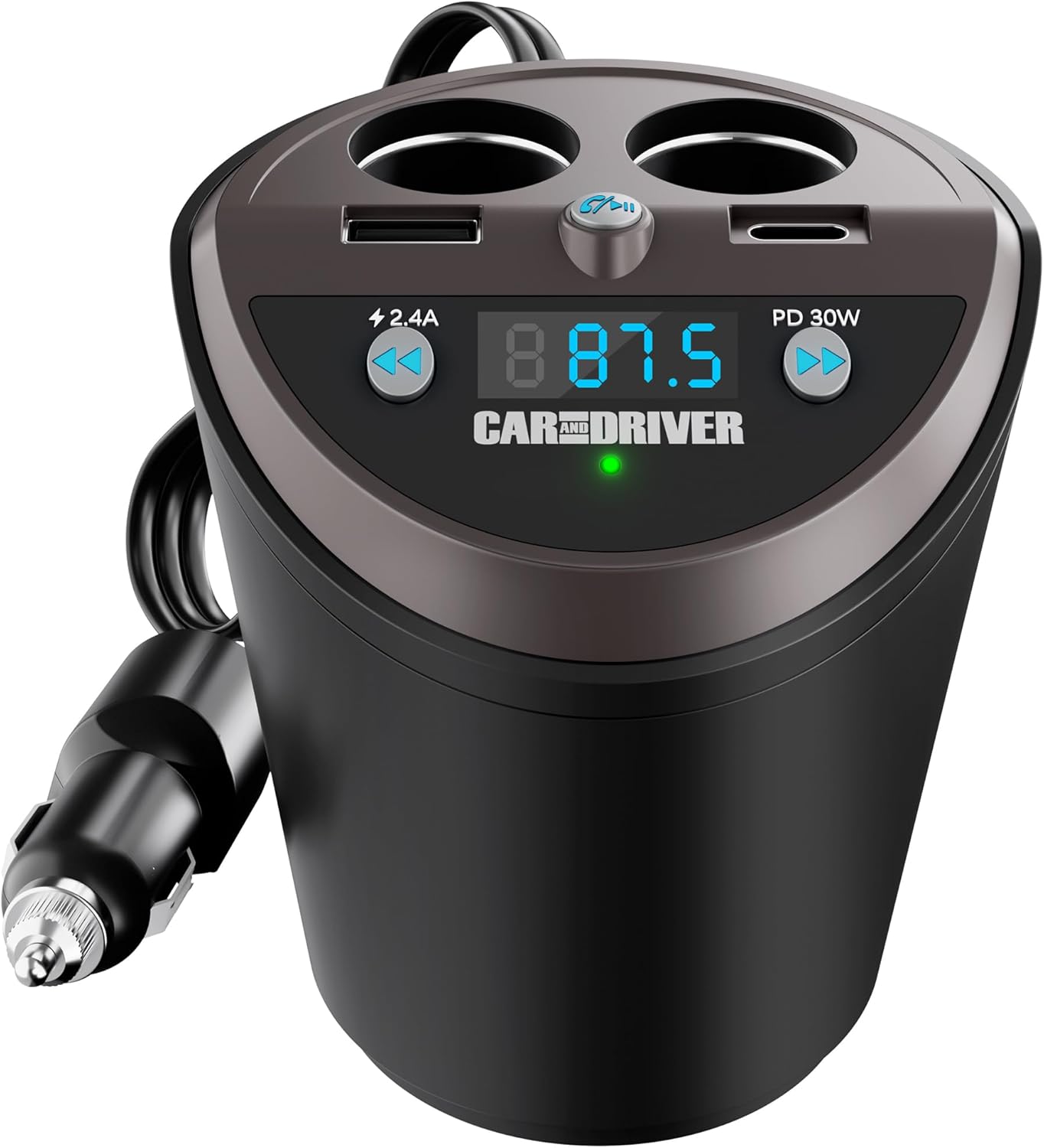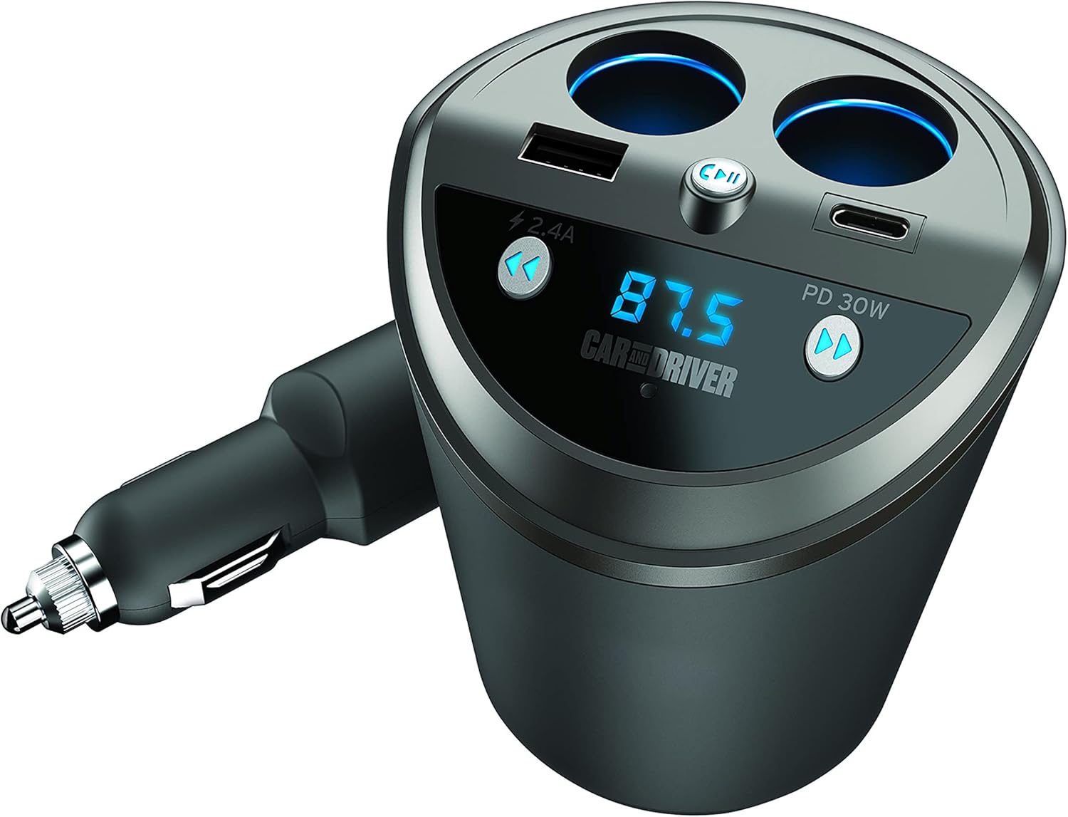 Car and Driver Smart FM Transmitter Bluetooth Cup Holder, Compatible with Alexa, Siri, and Google Assistant for Car, Dual USB-A and USB-C PD Fast-Charging Ports and Cigarette Lighter 12V Power Sockets