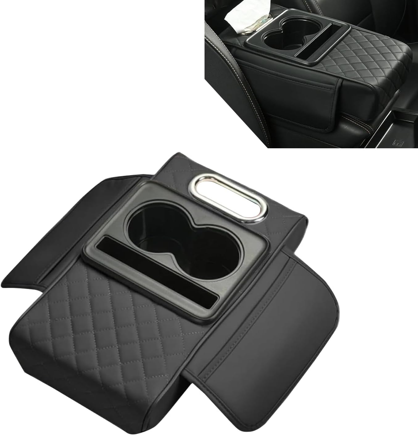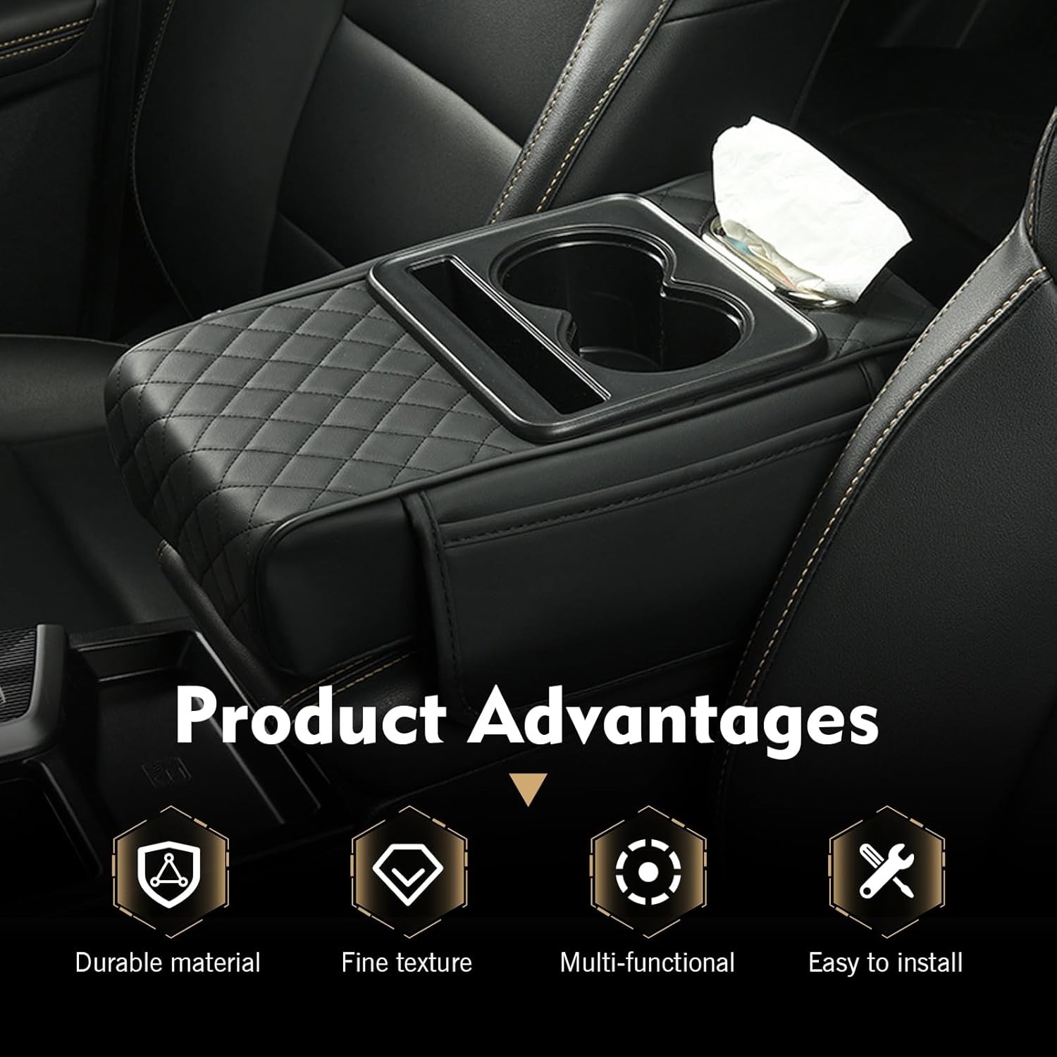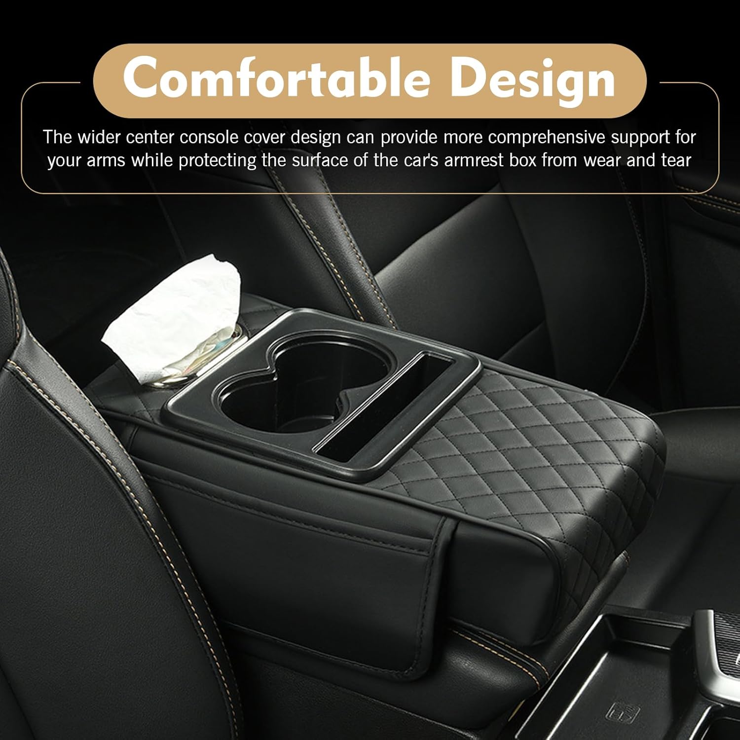 Multifunctional Design: This car armrest cover integrates storage box, cup holder, tissue box and phone slot in one, turning ordinary center consoles into practical automotive consoles & organizers to keep car interiors tidy and organized.