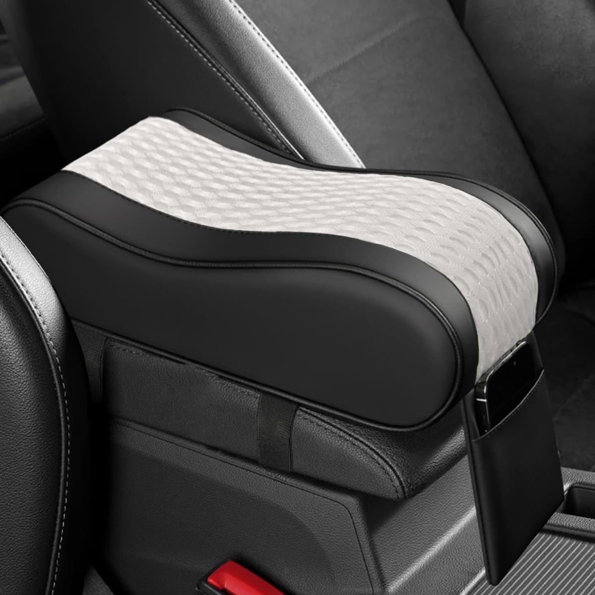 Car Armrest Cushion, Memory Foam Auto Center Console Armrest Pillow Pad with Storage Bag, Breathable Leather Middle Console Protective Pad with Phone Holder Relieve Elbow Pressure (WhiteGray)