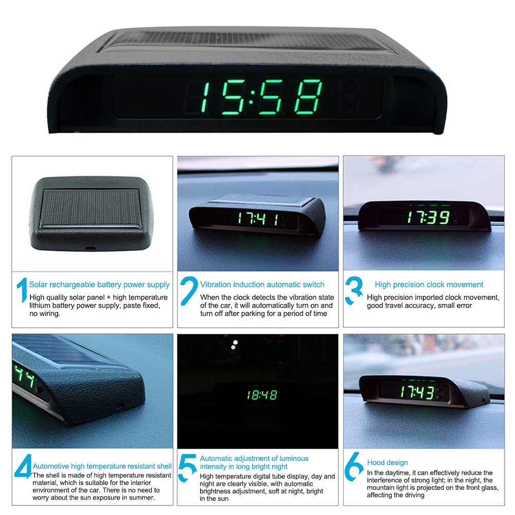 Solar Powered Design: The car clock features the rechargeable battery whose power supply is solar powered mode, and it features the solar panel + high temperature resistant battery power supply, which can be pasted and fixed without wiring.