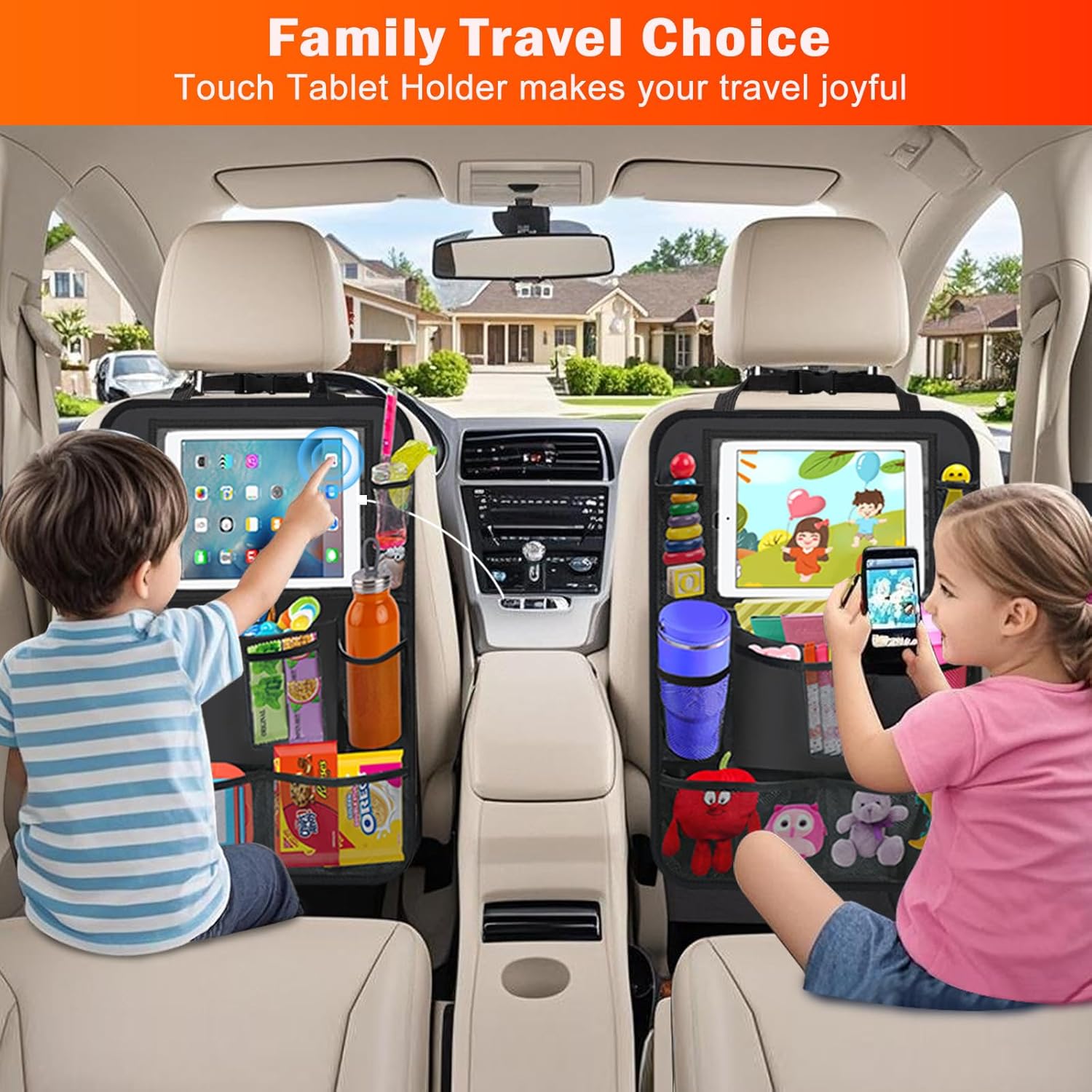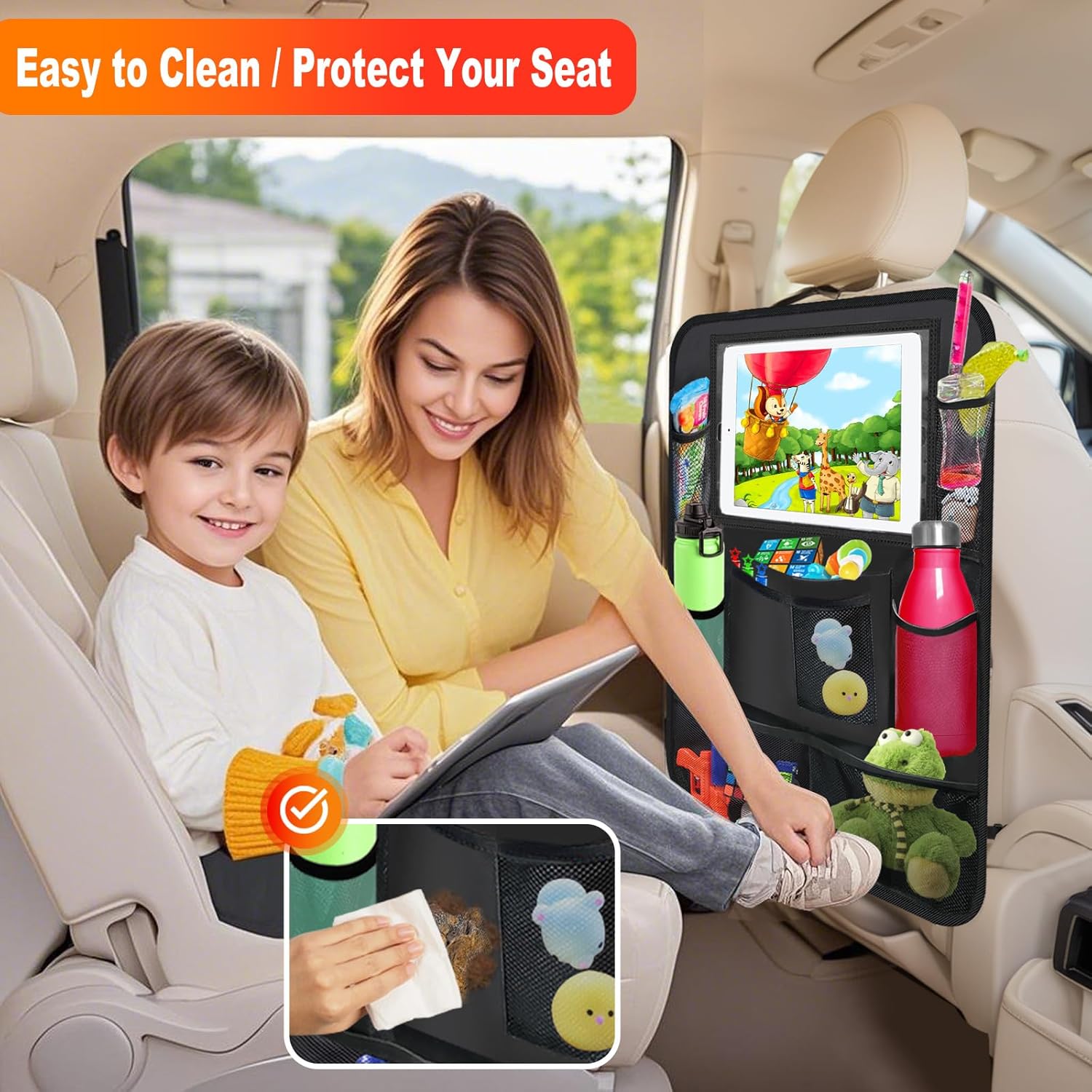 Our backseat organizer with a clear tablet holder will make your kids engaged and happy in car